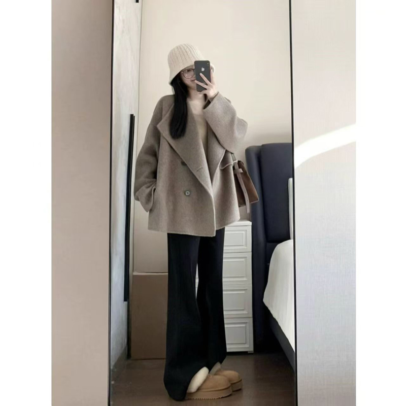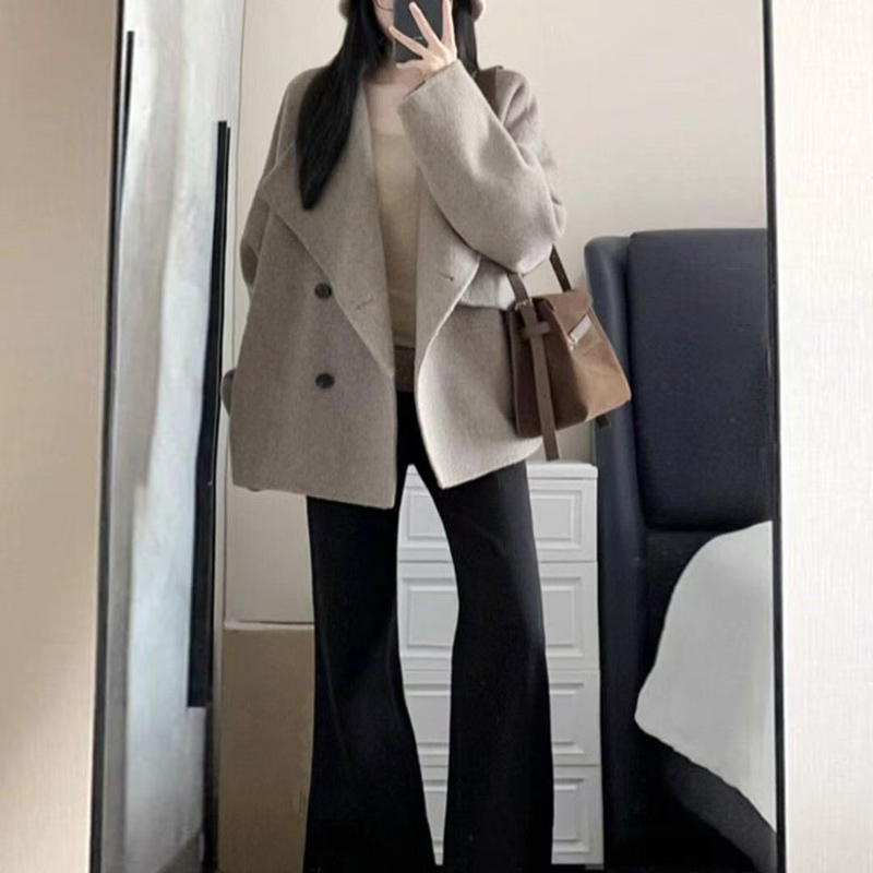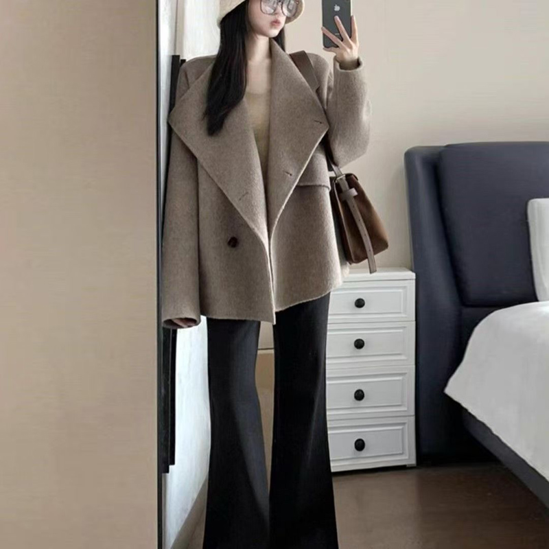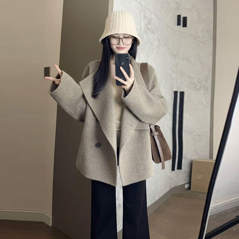 YF6453-图片色韩版大翻领长袖排扣纯色短款加绒加厚毛呢宽松大码风衣外套