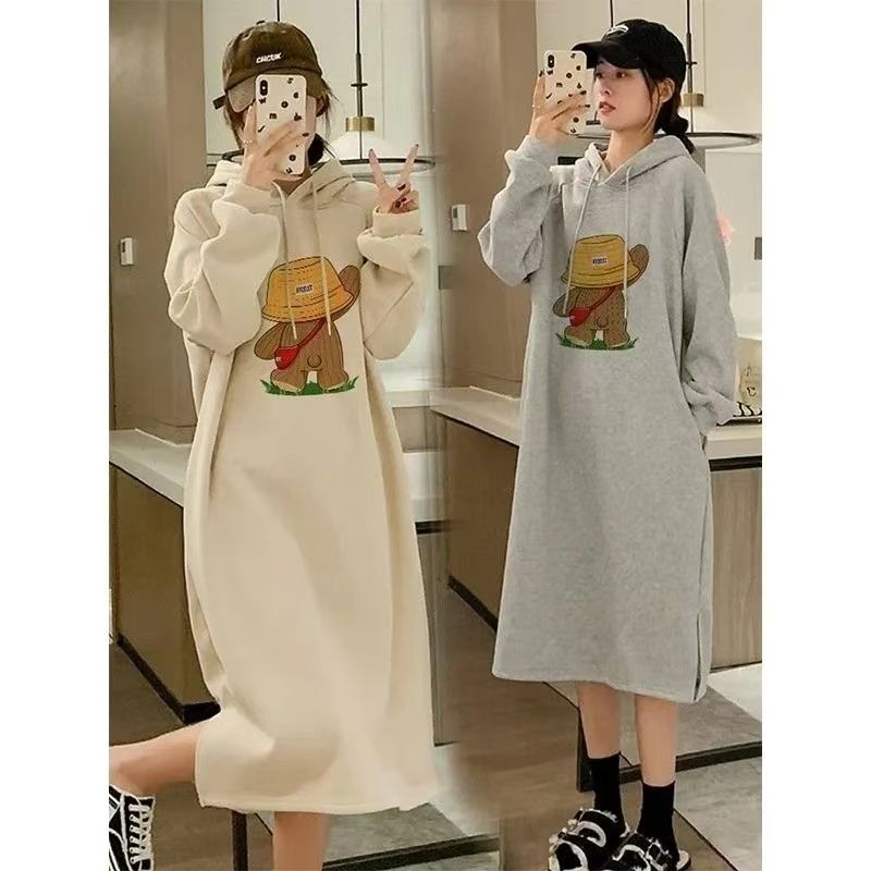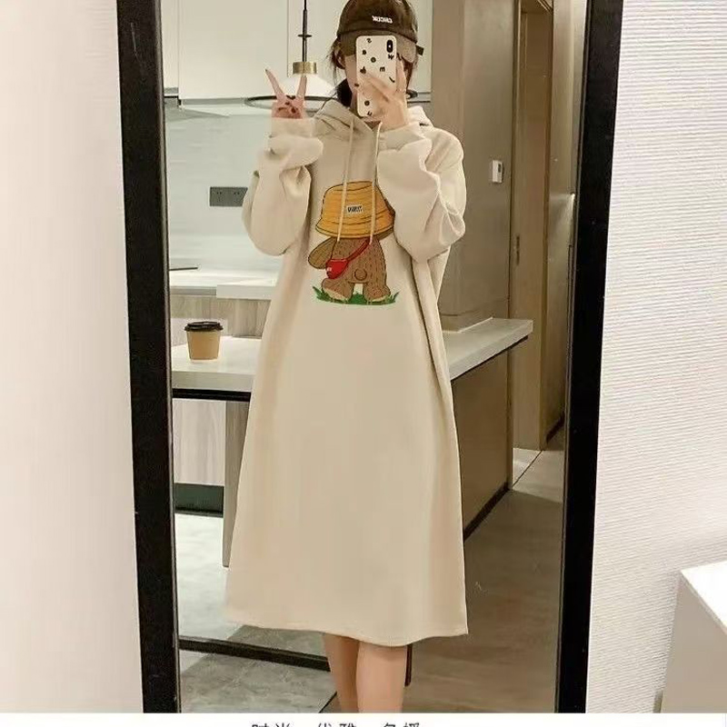 YF6456-(2色入内)港式冬季新款小可爱草帽熊熊印花长袖连帽开叉加绒卫衣裙