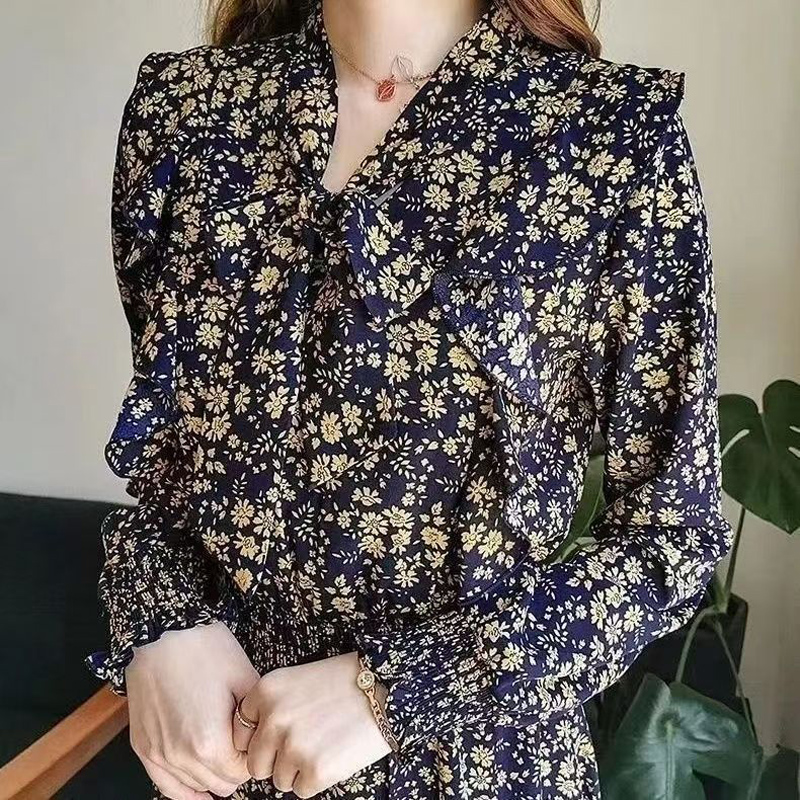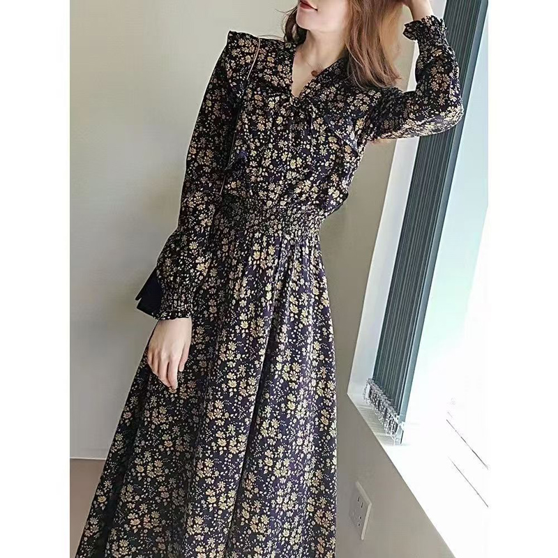 YF6481-图片色韩版优雅时尚长袖系蝴蝶结系带松紧腰碎花赫本风连衣裙