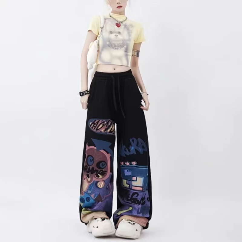 YF6483-(2色入内)美式多巴胺不规则涂鸦卡通个性松紧腰绑绳直筒坠地感休闲卫衣裤