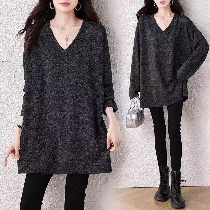 YF6492-图片色春秋大码显瘦V领慵懒风港式中长款时尚百搭纯色休闲潮T恤