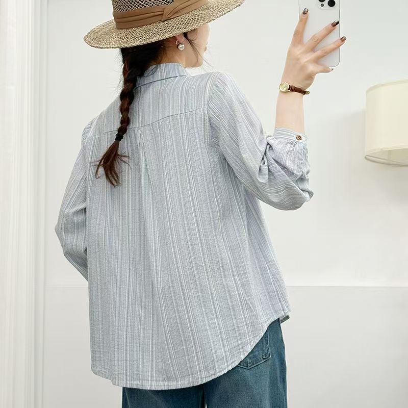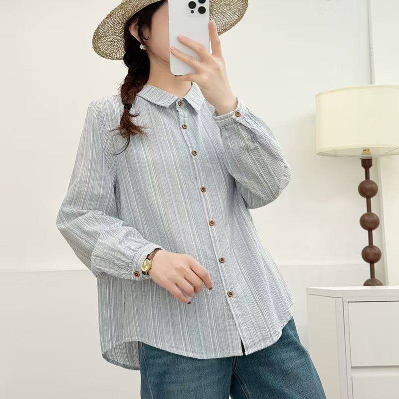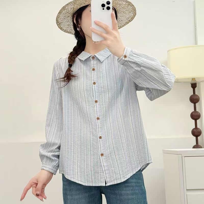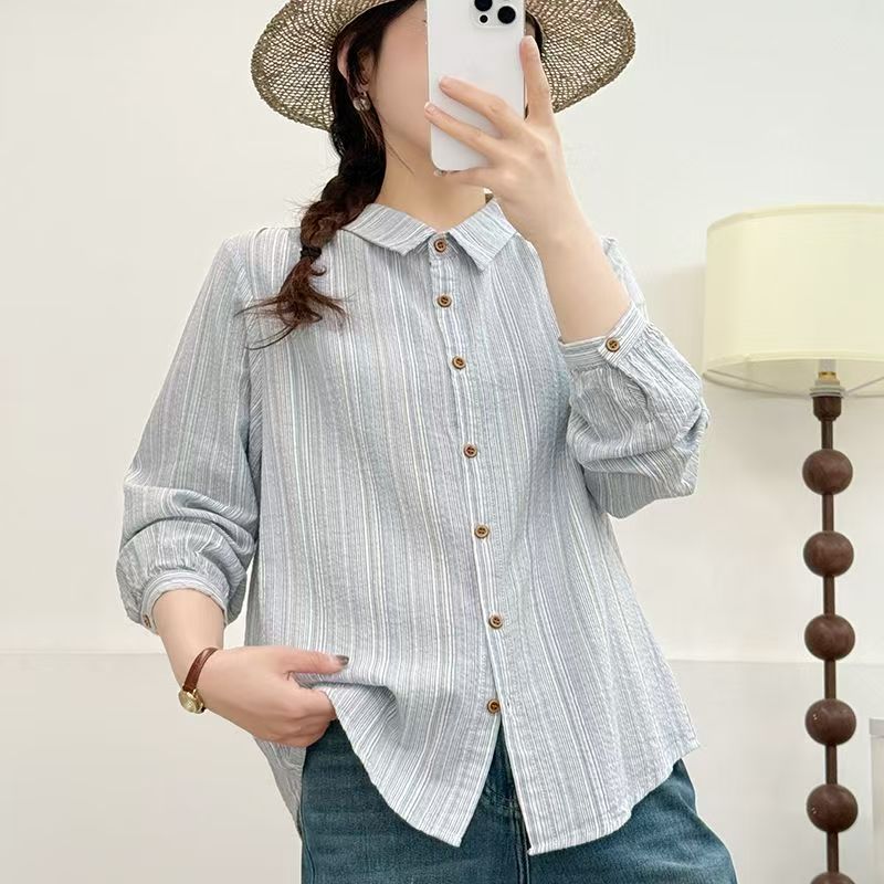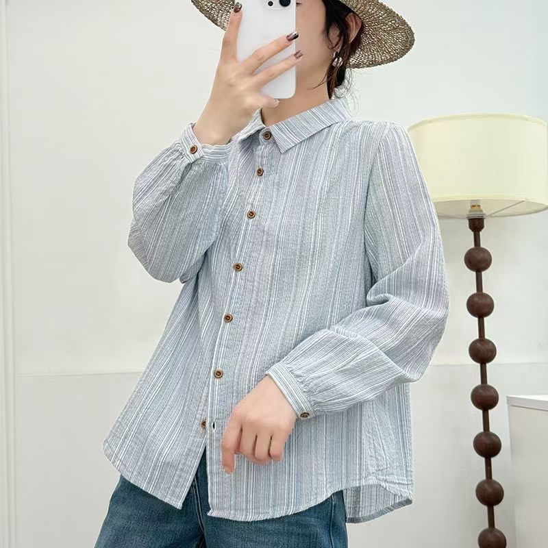 YF6496-图片片文艺风长袖翻领条纹显瘦长袖翻领宽松大码复古风肌里纹衬衣