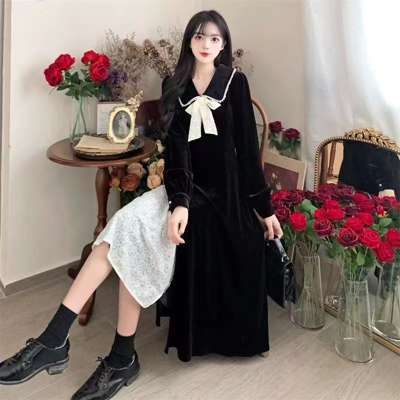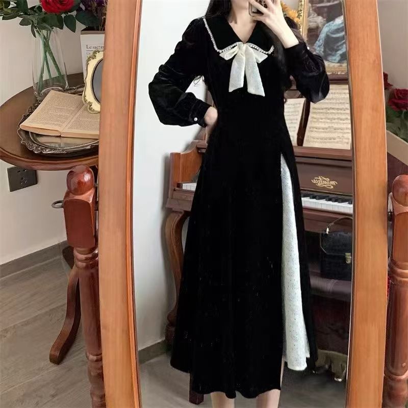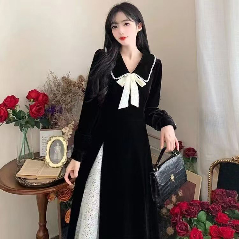 YF6498-图片色甜美时尚娃娃领系蝴蝶结撞色开叉拼接设计感金丝绒冬季连衣裙