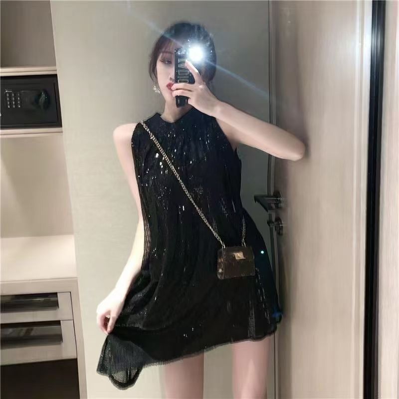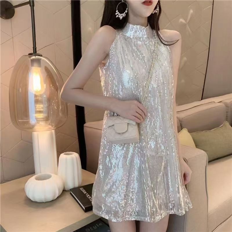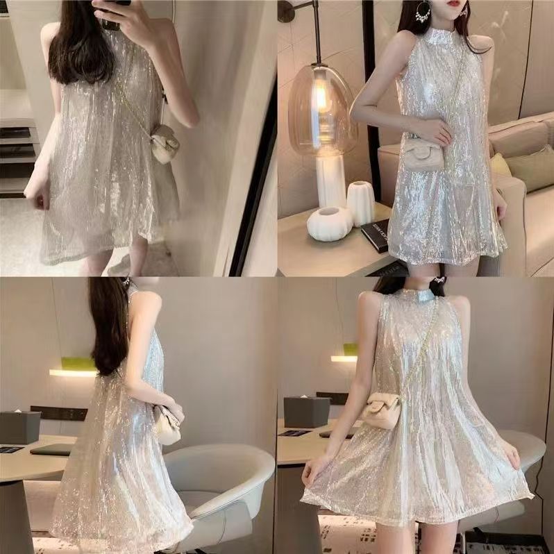 YF6602-(2色入内)高级感无袖围脖A字闪闪亮片小众设计宽松大码小礼服短裙