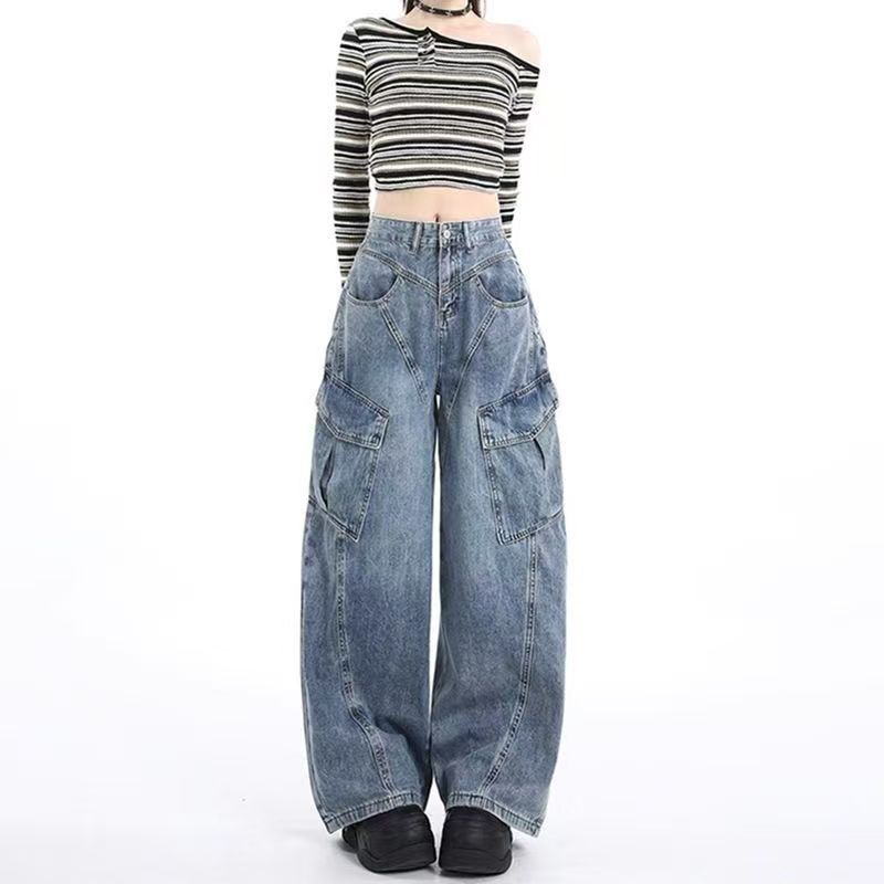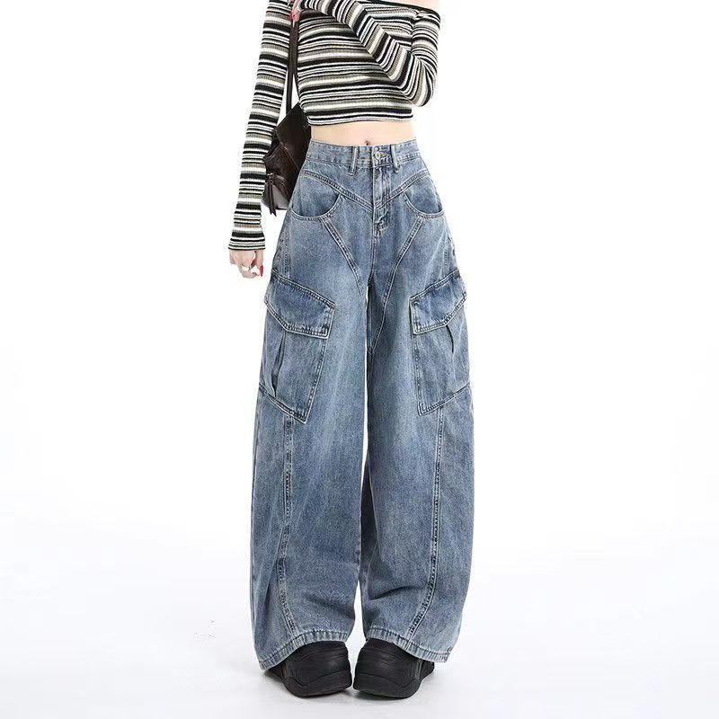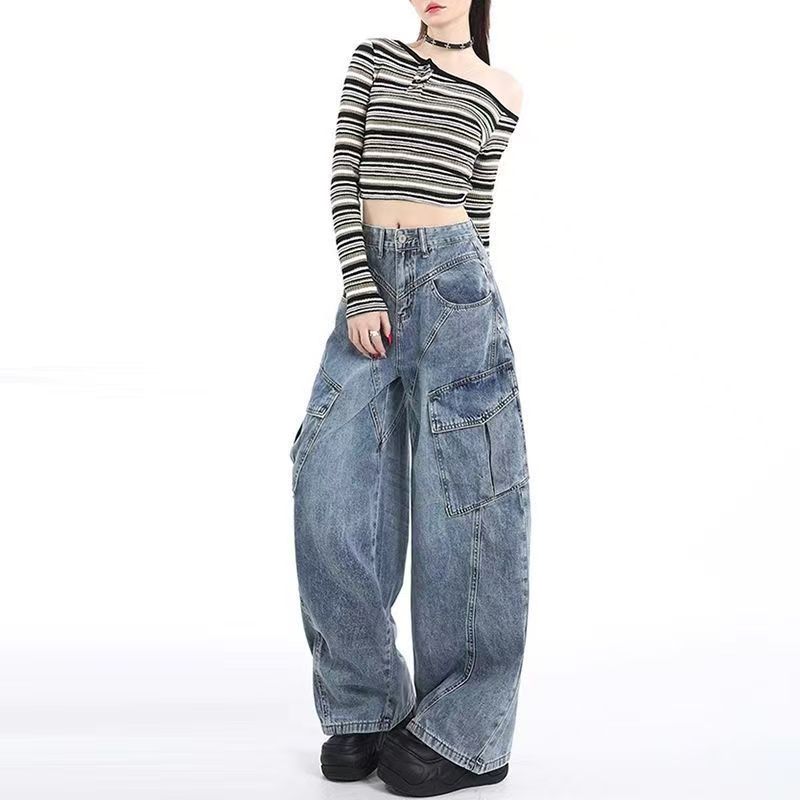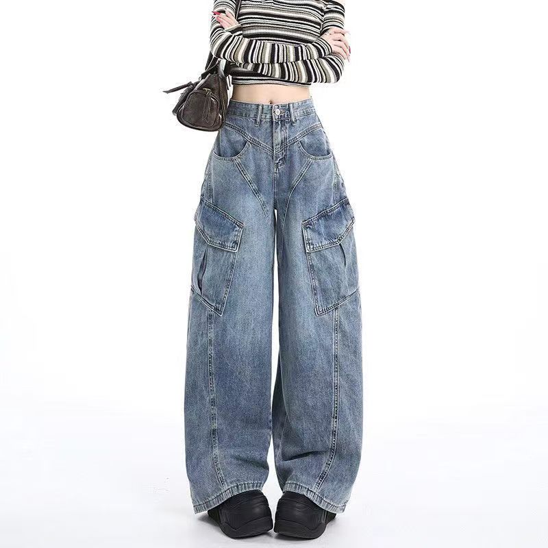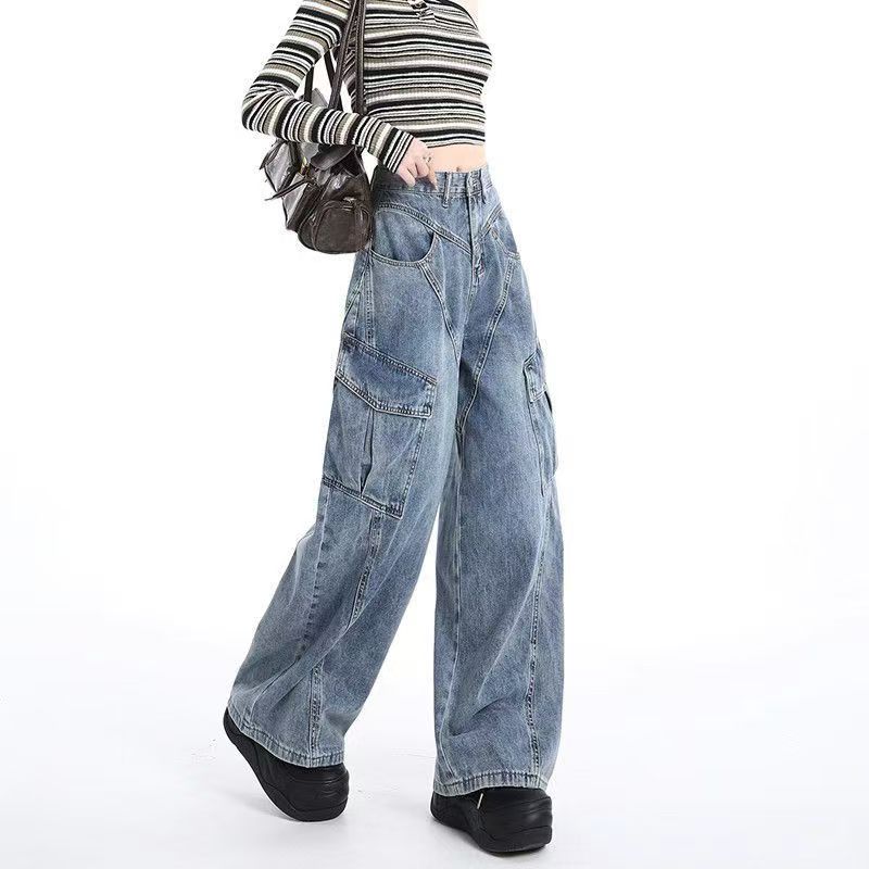 YF6604-图片色韩版慵懒风新款系扣高腰拼接阔腿坠地感大码休闲牛仔裤