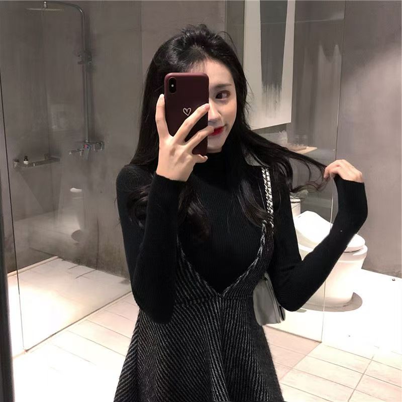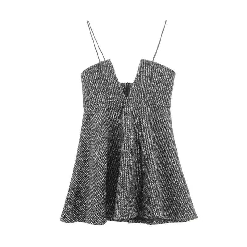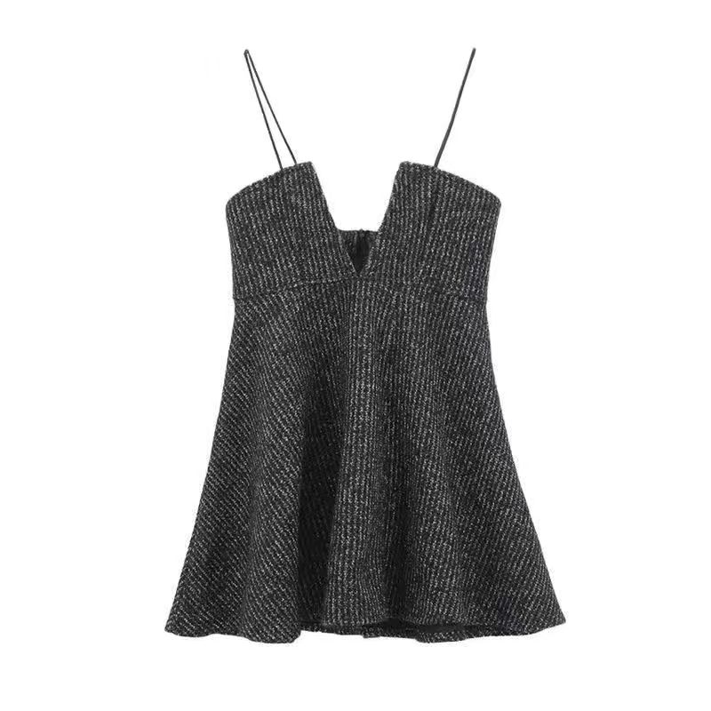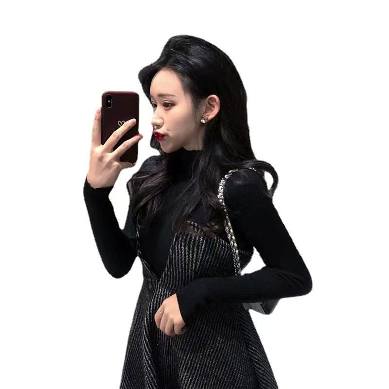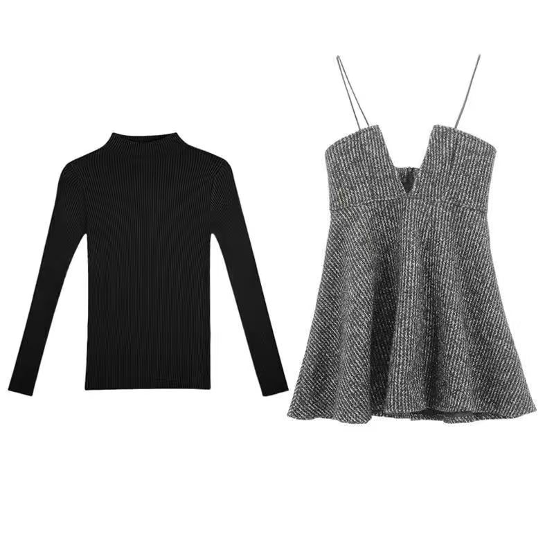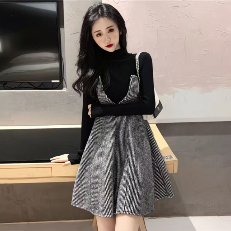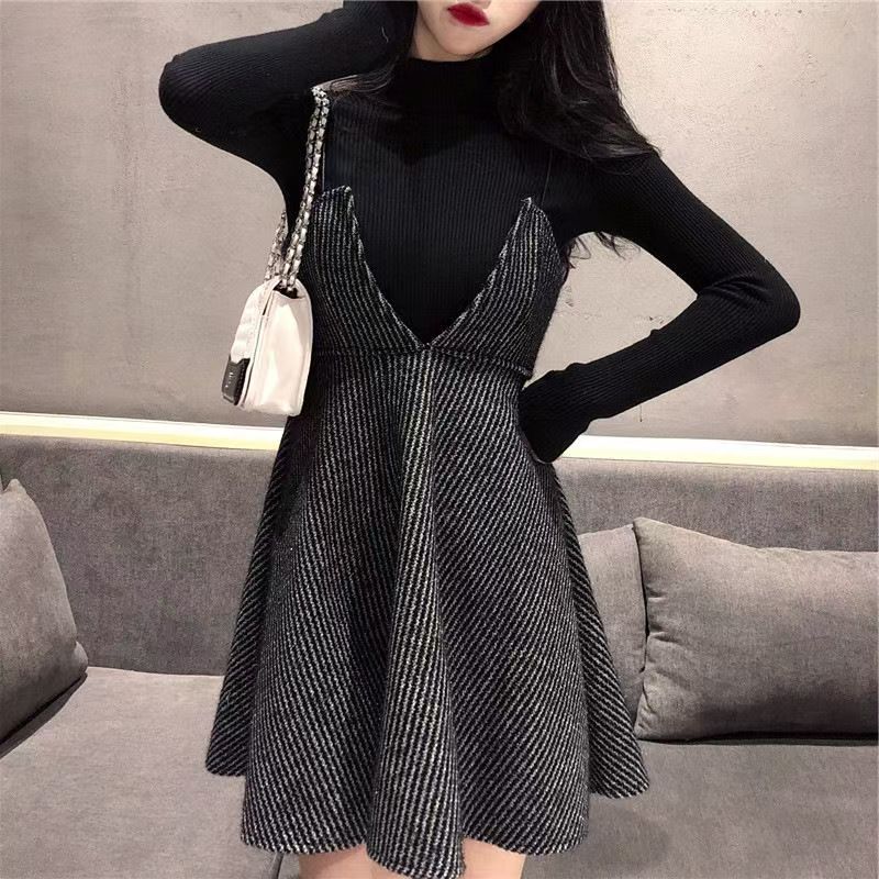 YF6520-(2色入内)甜美时尚吊带修腰V领暗纹毛呢保暖秋冬时尚设计吊带连