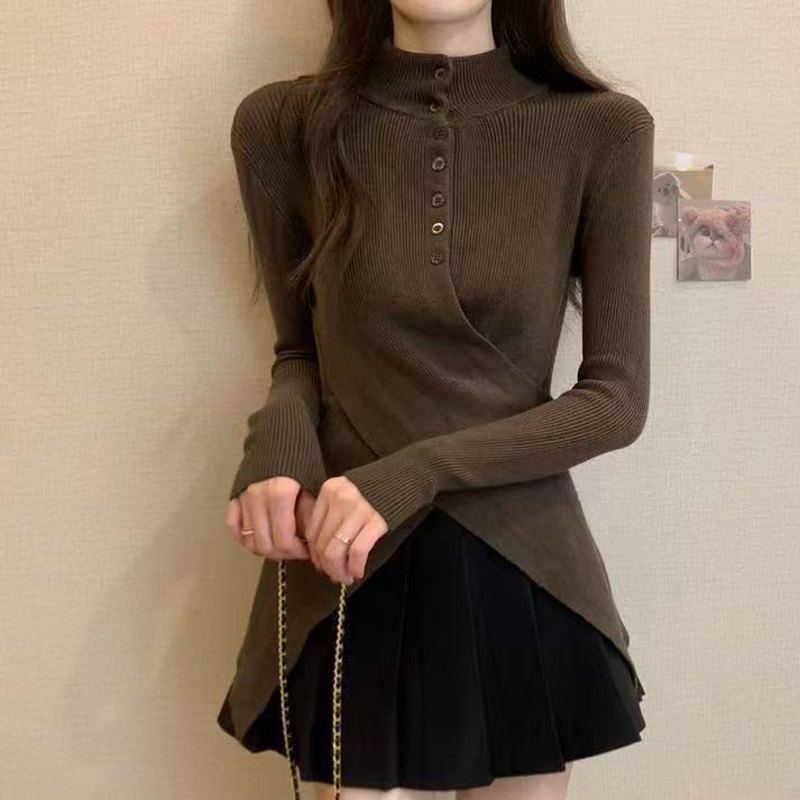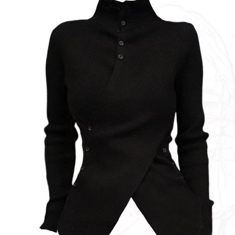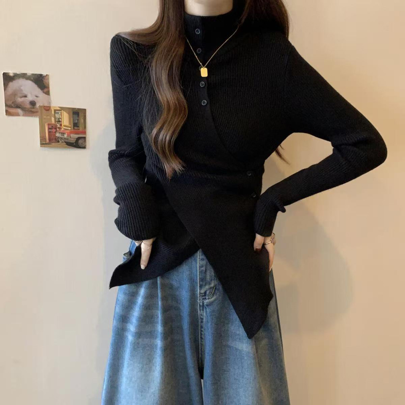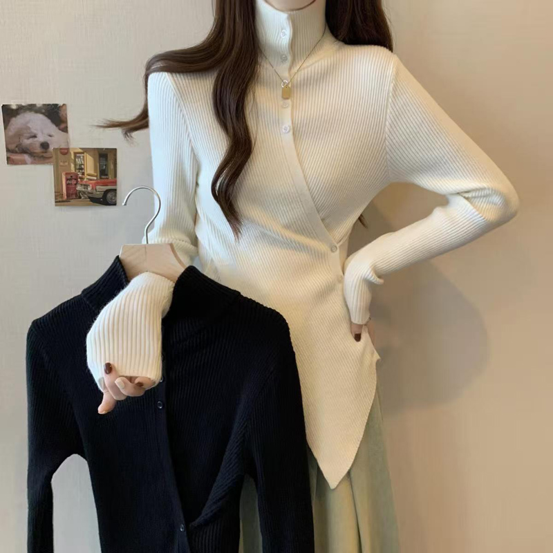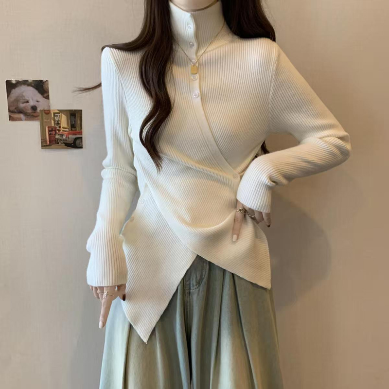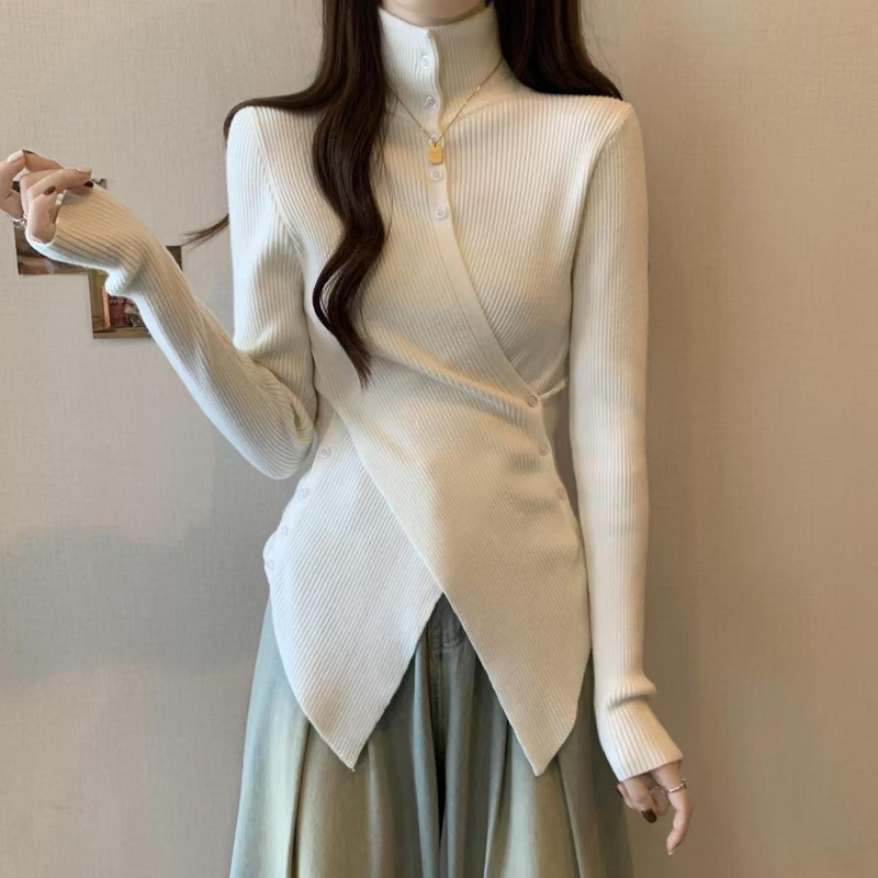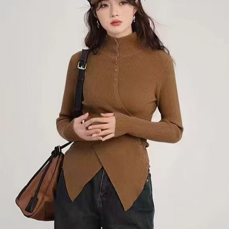 YF6521-(4色入内)洋气小众设计高领系扣不规则弧边交叉修腰显瘦针织上衣