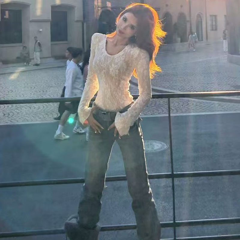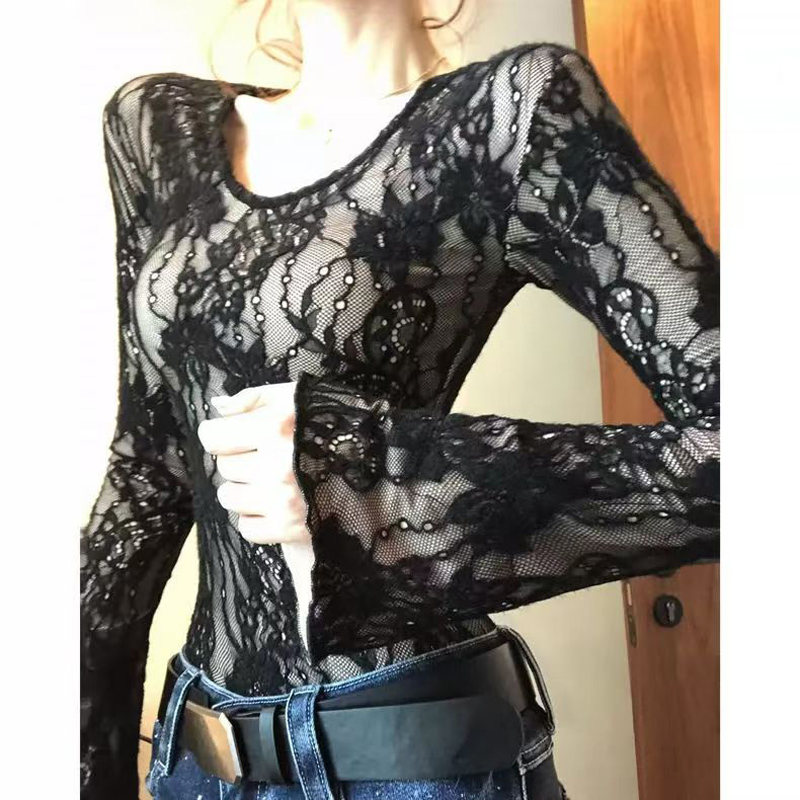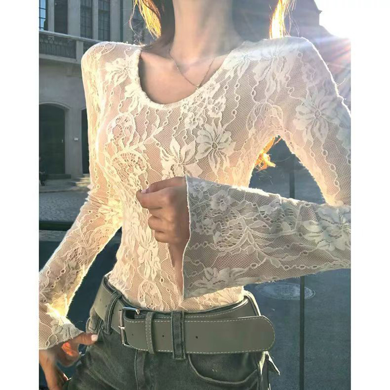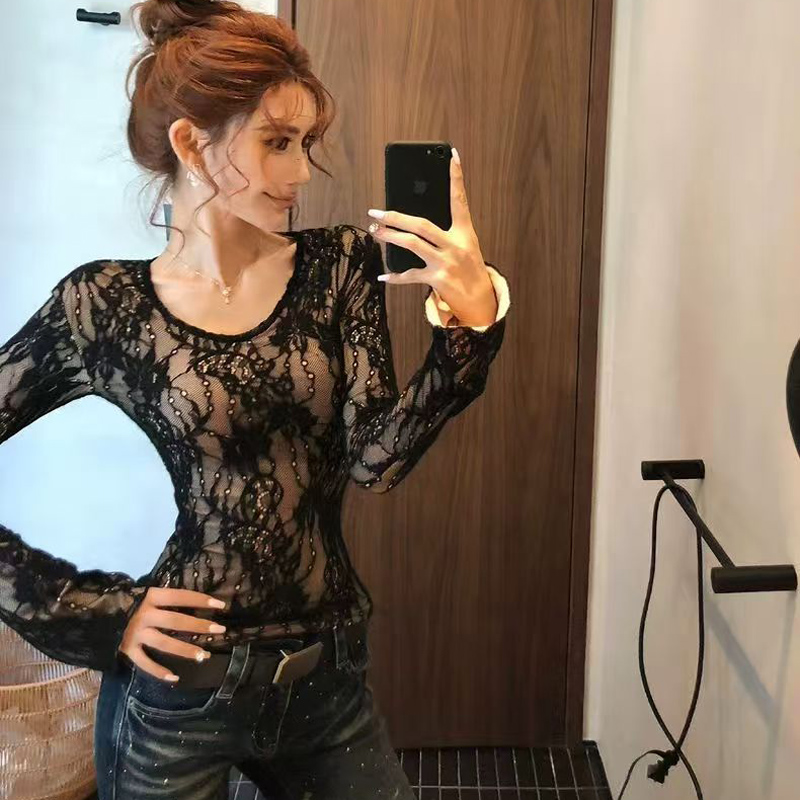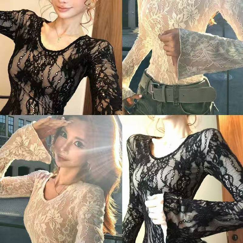 YF6524-(2色入内)性感时尚辣妹蕾丝圆领长袖弹力修身镂空提花纯欲风打打底衫