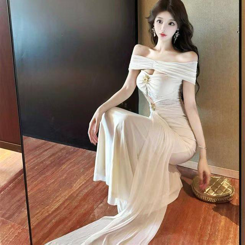 YF6525-图片色名媛气质一字肩褶折抹胸弹力收腰包臀鱼尾设计网纱礼服长裙