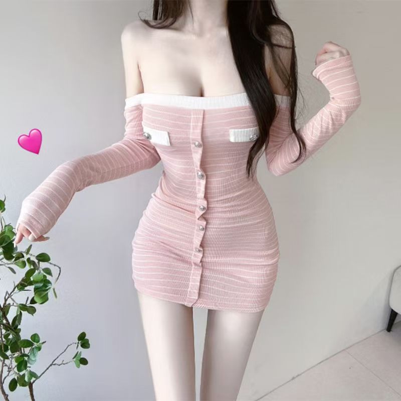 YF6526-(3色入内)秋冬纯欲风一字肩露肩排扣条纹弹力包臀显瘦针织礼服连衣裙