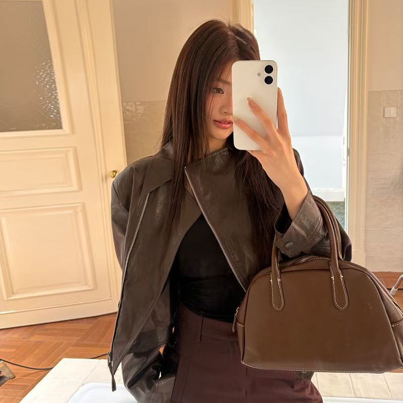 YF6527-图片色辣妹新款机车设计长袖POLO领拉链短款PU皮冬季夹克外套