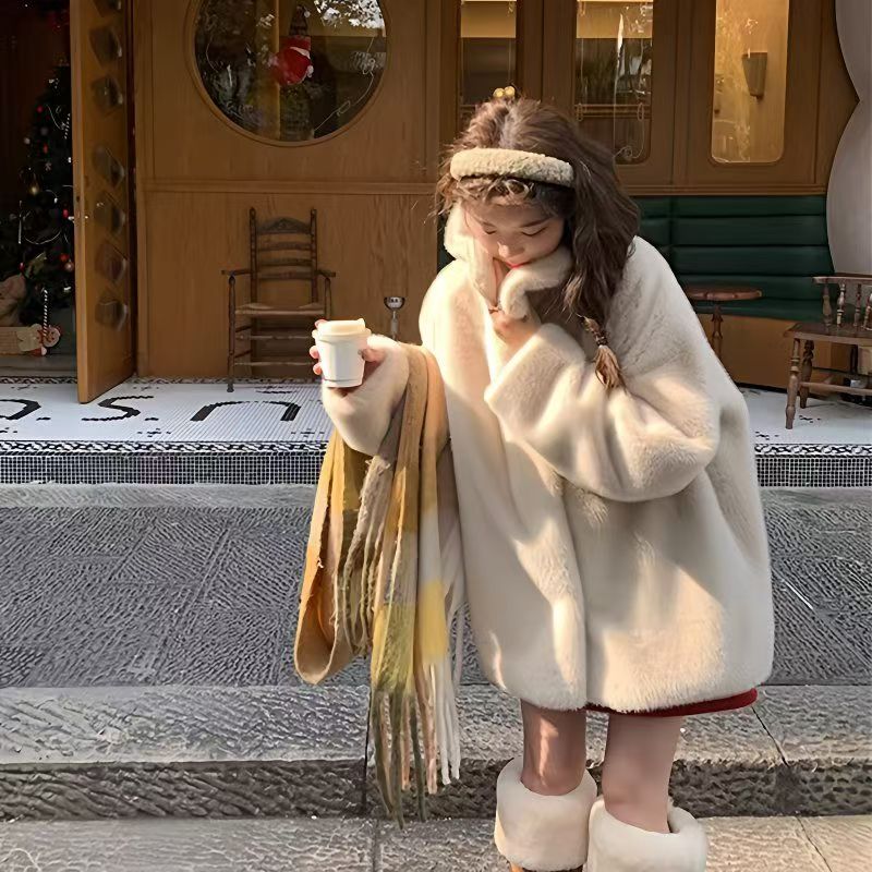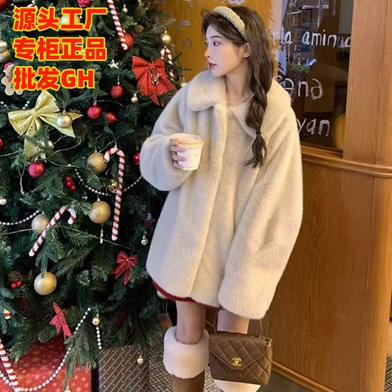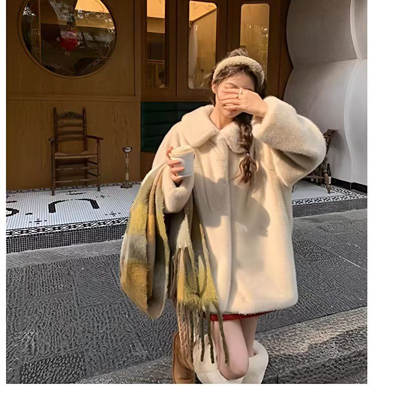 YF6638-图片色冬季加加绒加厚娃娃领系扣宽松大码水貂皮草高级感外套