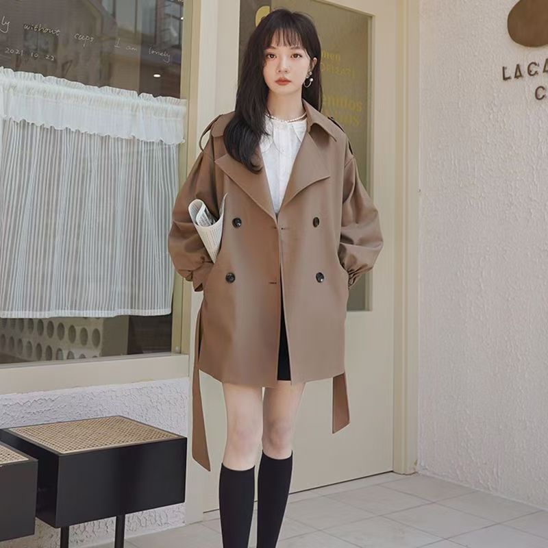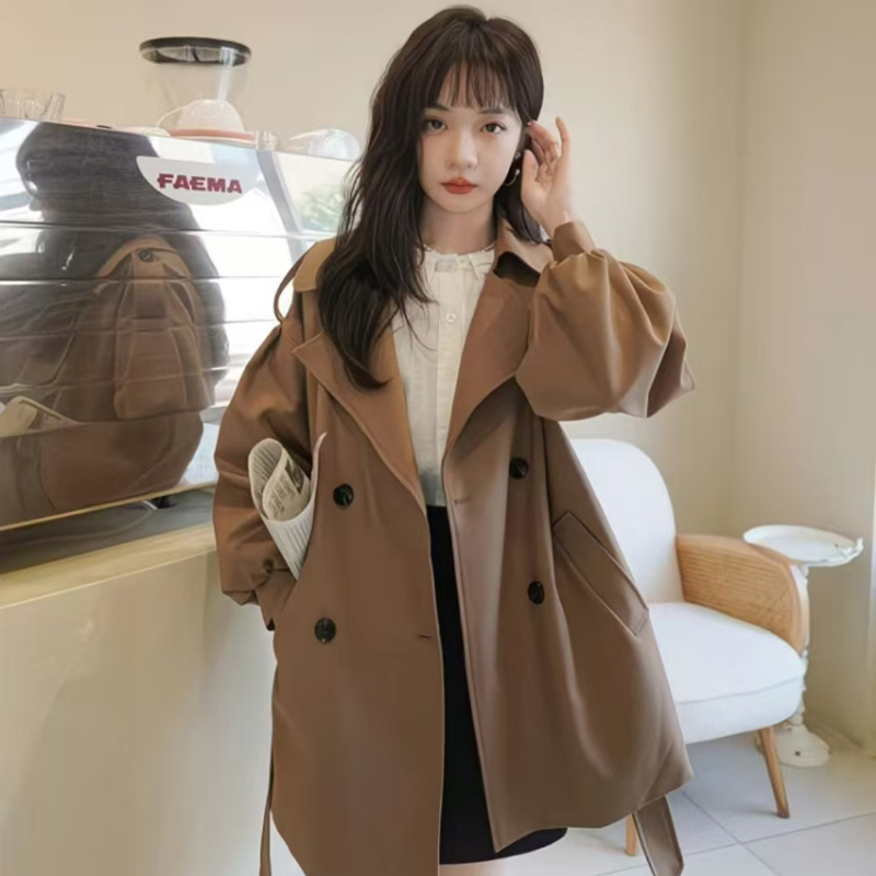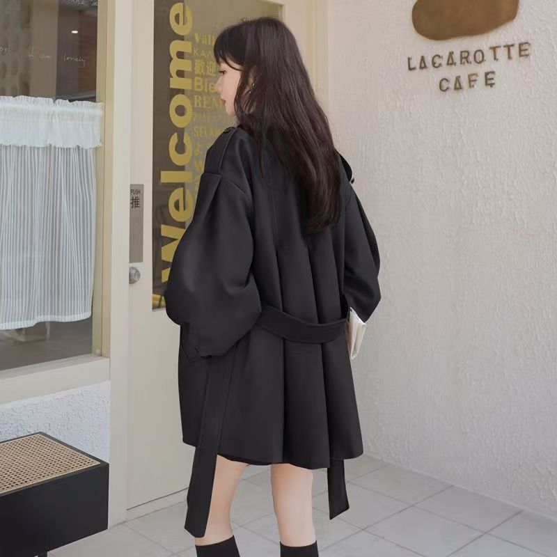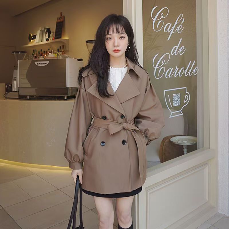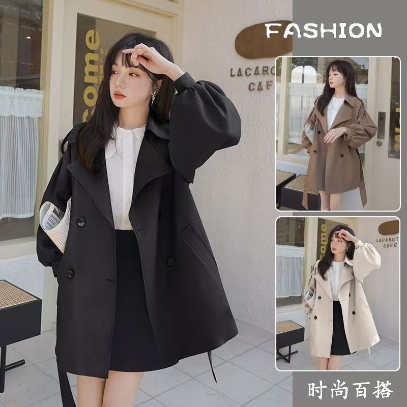 YF6640-(3色入内)英伦风秋冬风衣外套 灯笼袖西装领双排扣系腰大衣