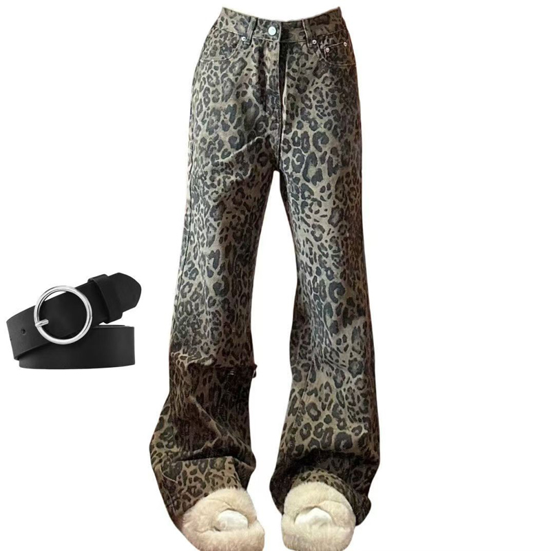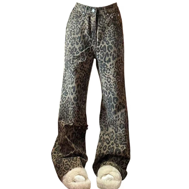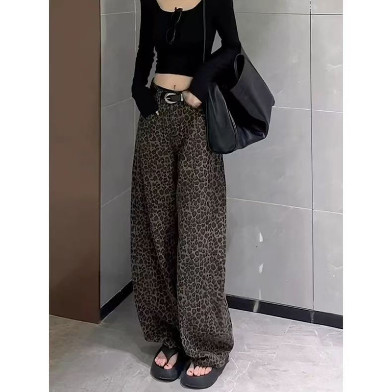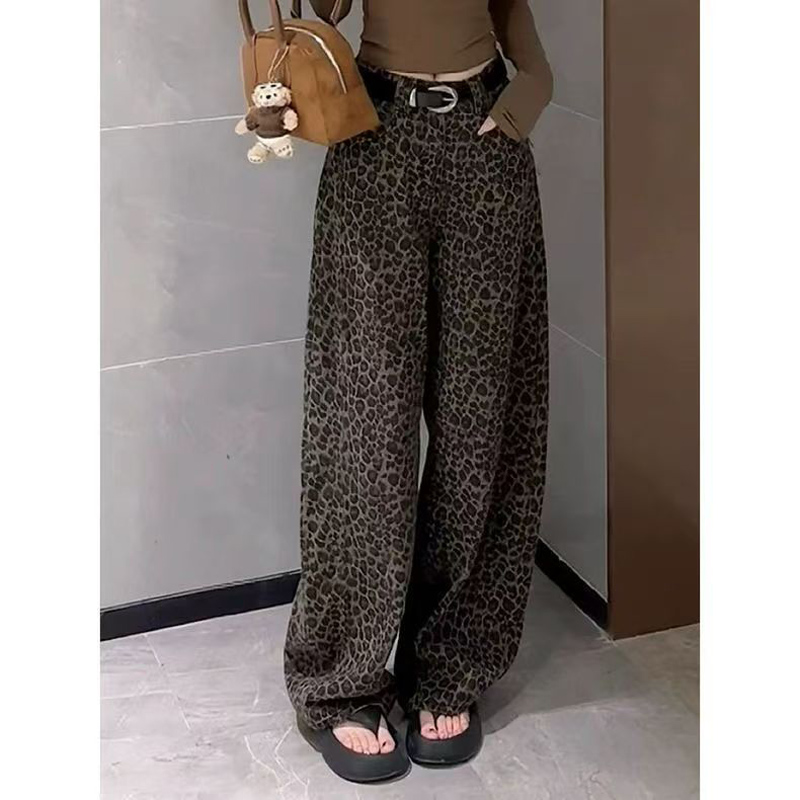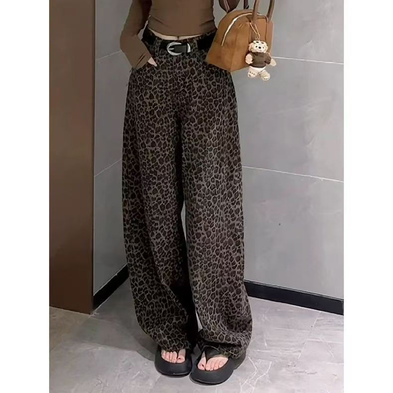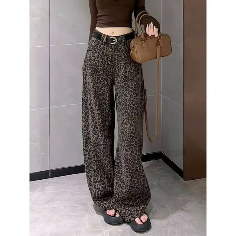 YF6651-图片色韩版辣妹新款豹纹印花高腰直筒坠地感复古设计牛仔裤