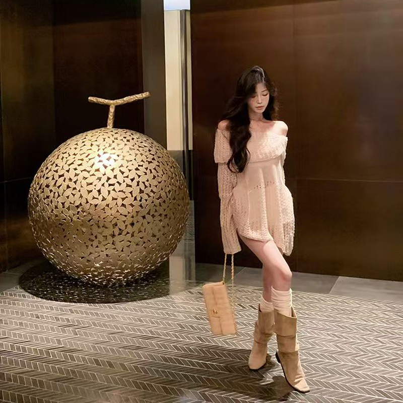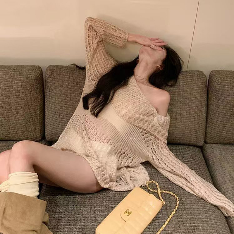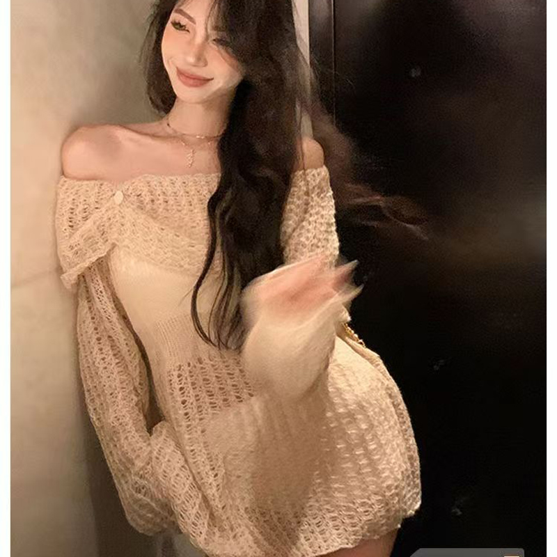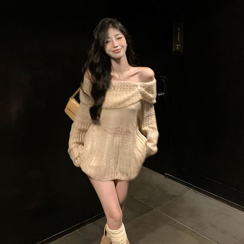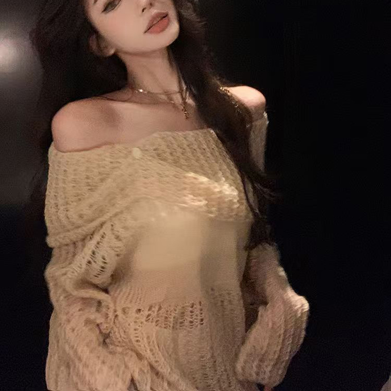 YF6652-图片色秋冬洋气镂空设计一字肩长袖翻领慵懒风显瘦针织休闲上衣
