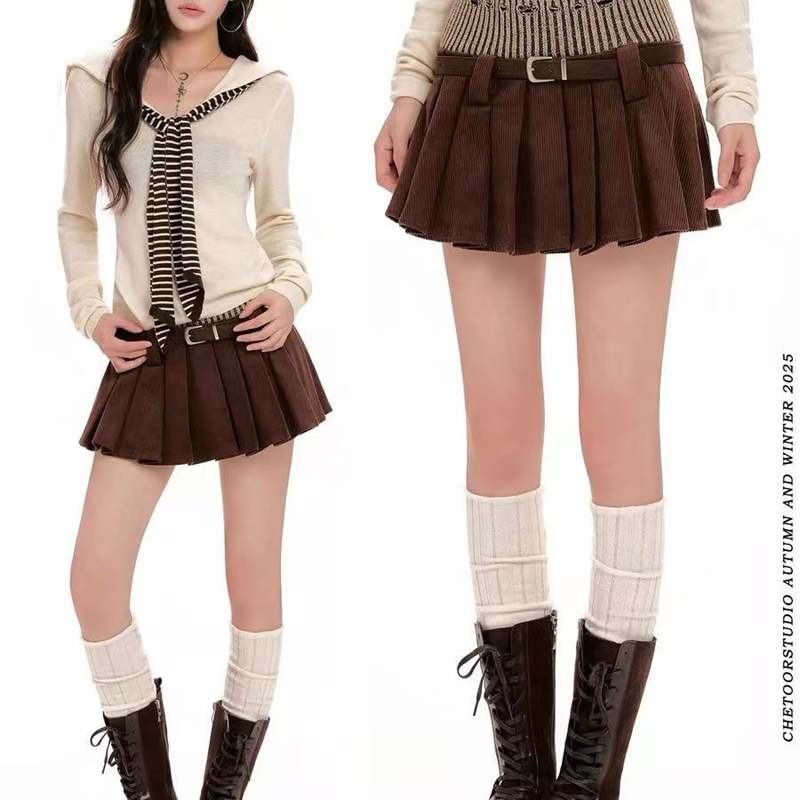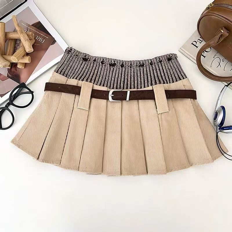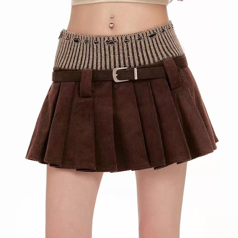 YF6660-(3色入内)时尚冬季小心机设计植绒提花针织拼接灯芯绒褶折A字迷你短
