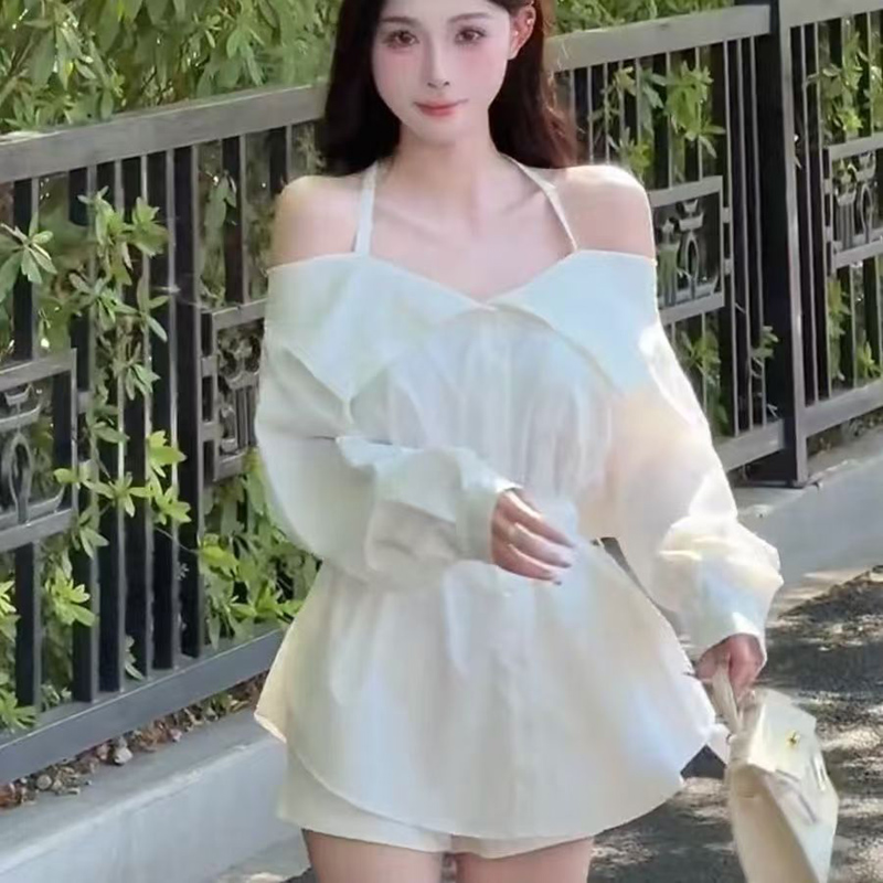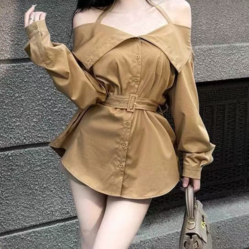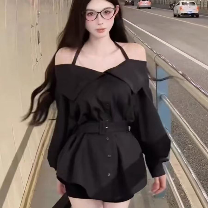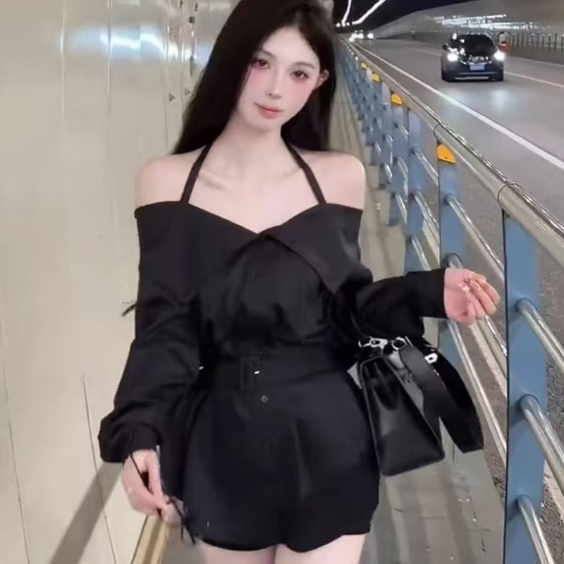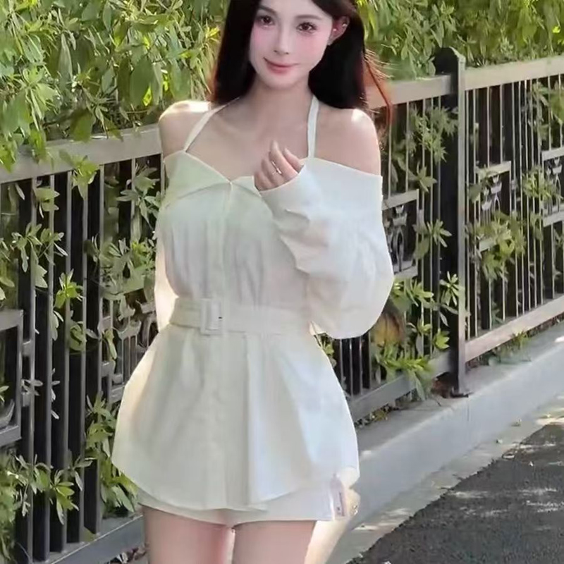 YF6661-(3色入内)辣妹性感新款围脖吊带尖领系扣系腰带泡泡袖洋气上衣