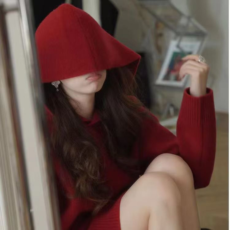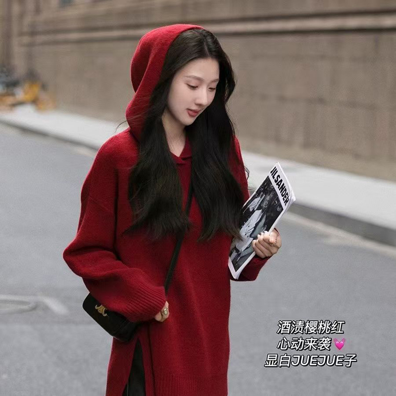YF6662-图片色冬装慵懒风长袖连帽前短后长设计开叉红色针织中长款上衣