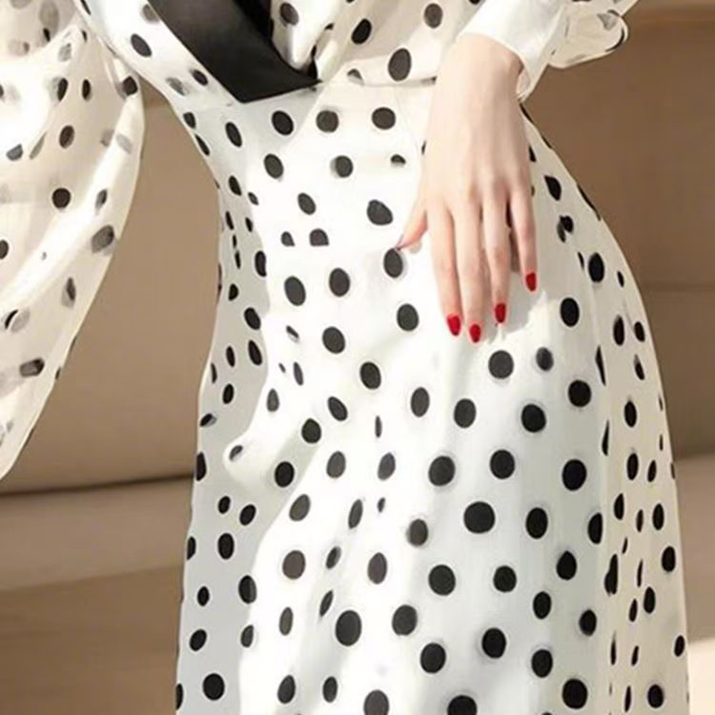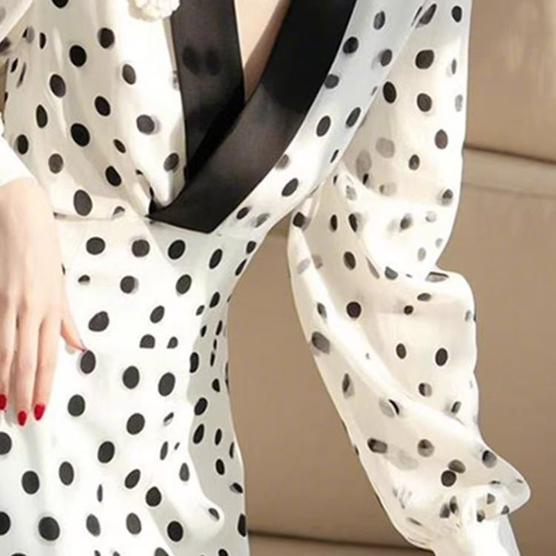 YF6664-图片色韩版撞色V领黑白波点设计收腰显瘦轻熟得体雪纺连衣裙