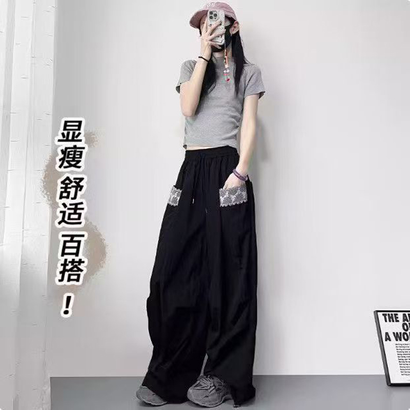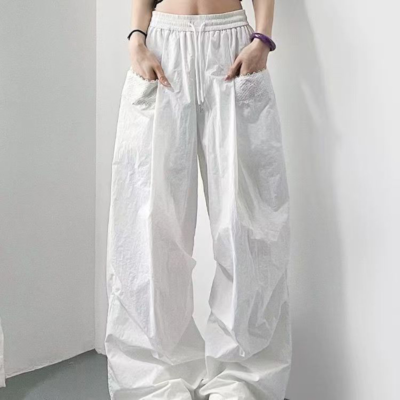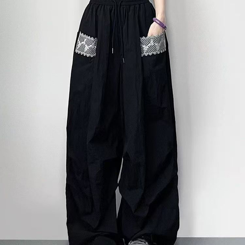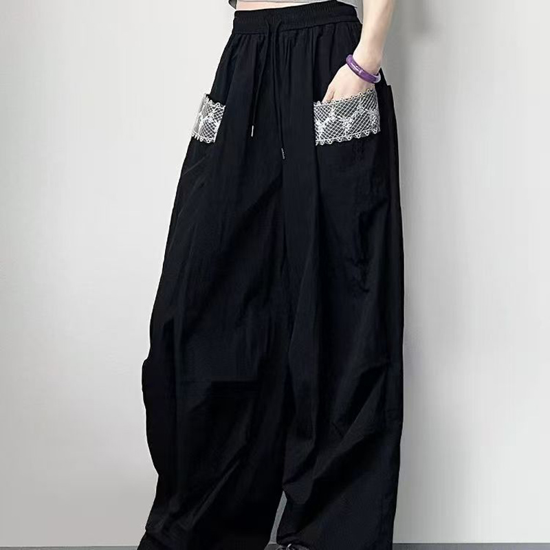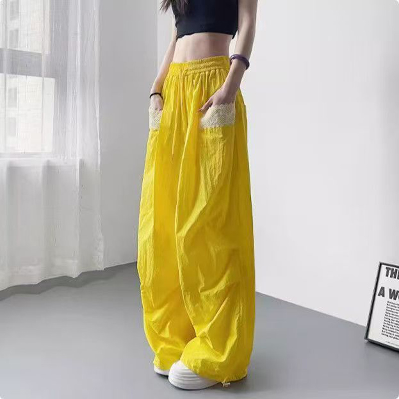 YF6667-(4色入内)港式新款抽绳松紧腰蕾丝口袋设计阔腿运动速干运动裤