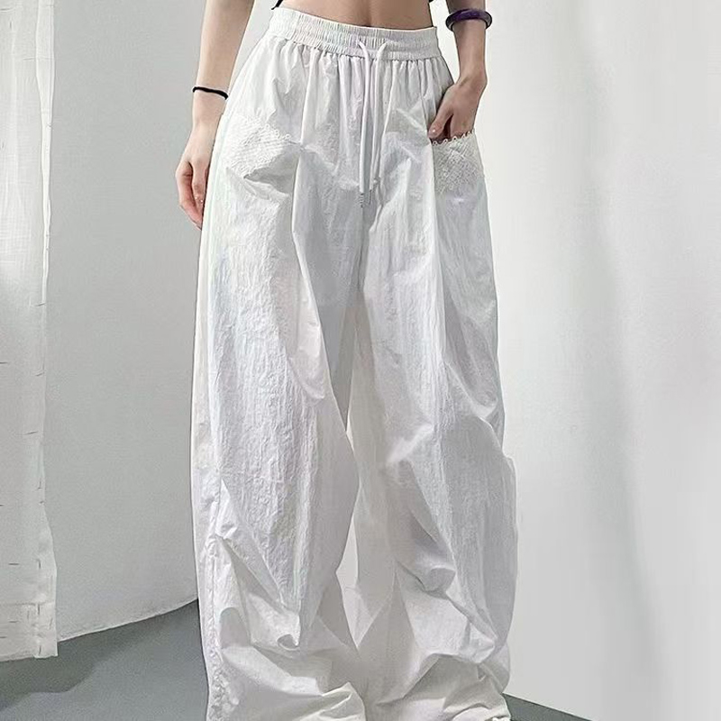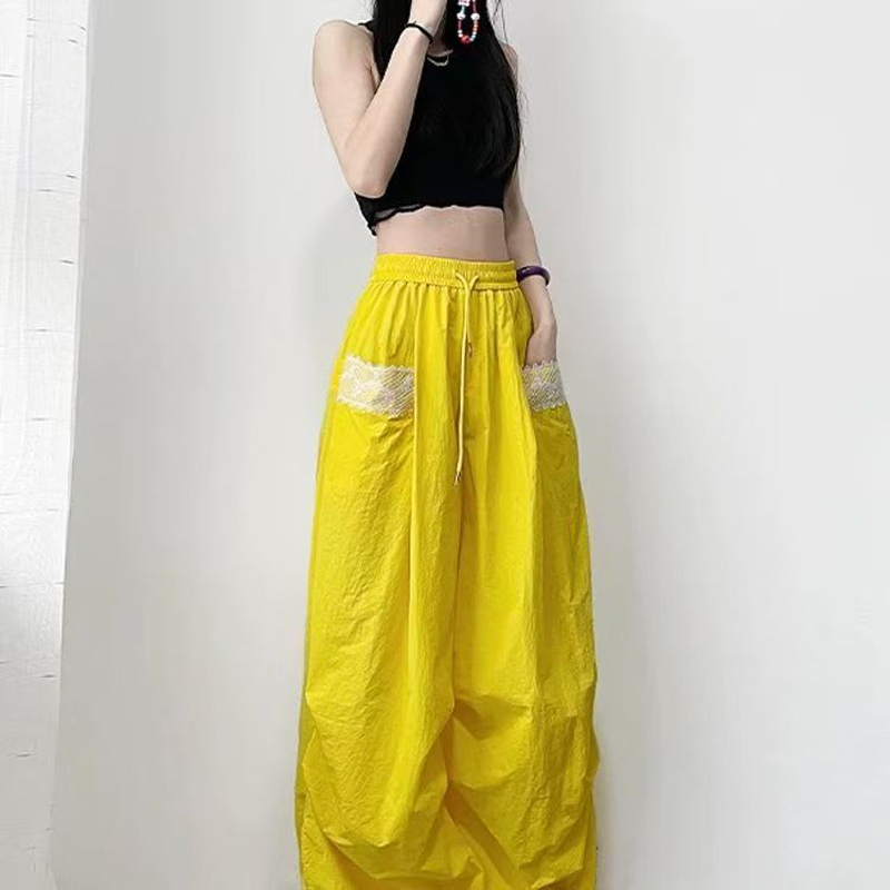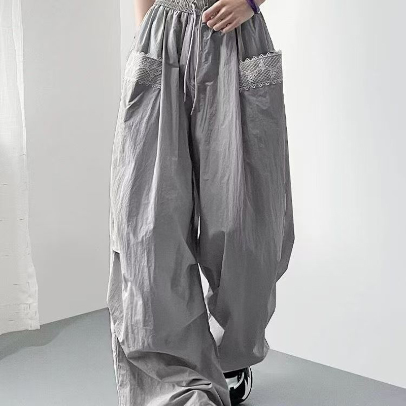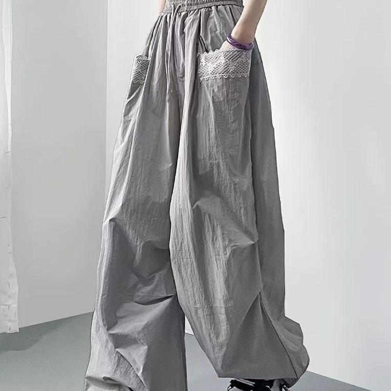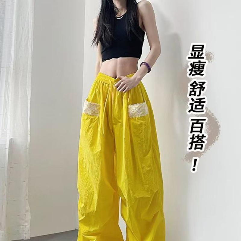 YF6667-(4色入内)港式新款抽绳松紧腰蕾丝口袋设计阔腿运动速干运动裤