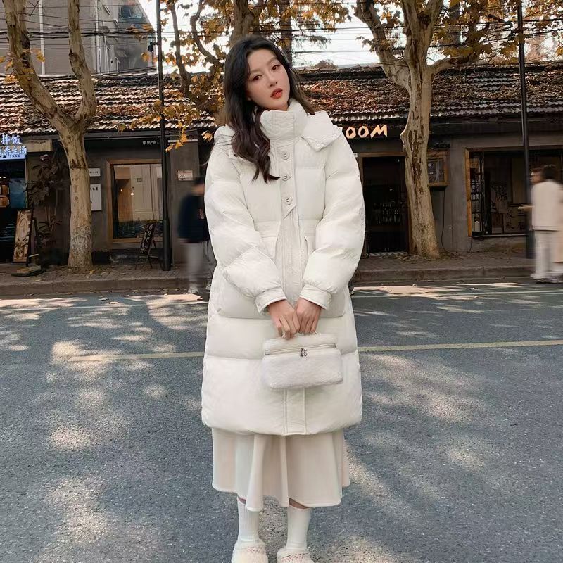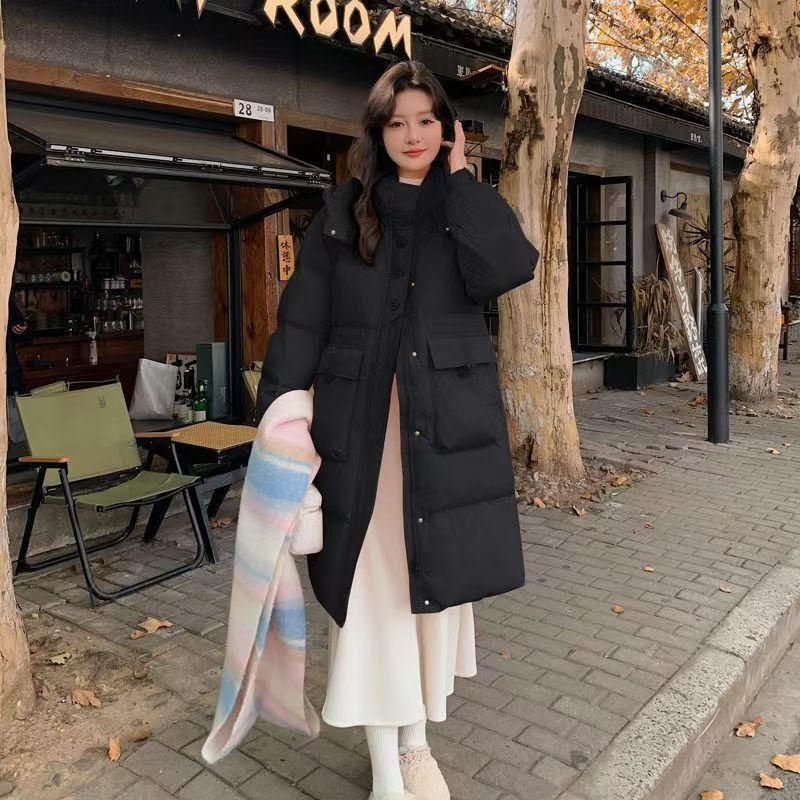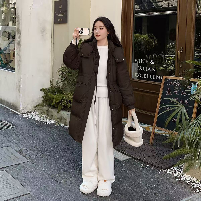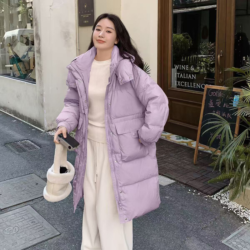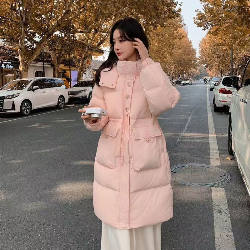 YF6670-(4色入内)韩版加厚加绒长袖连帽系扣拉链防风过膝中长款羽绒大衣外套