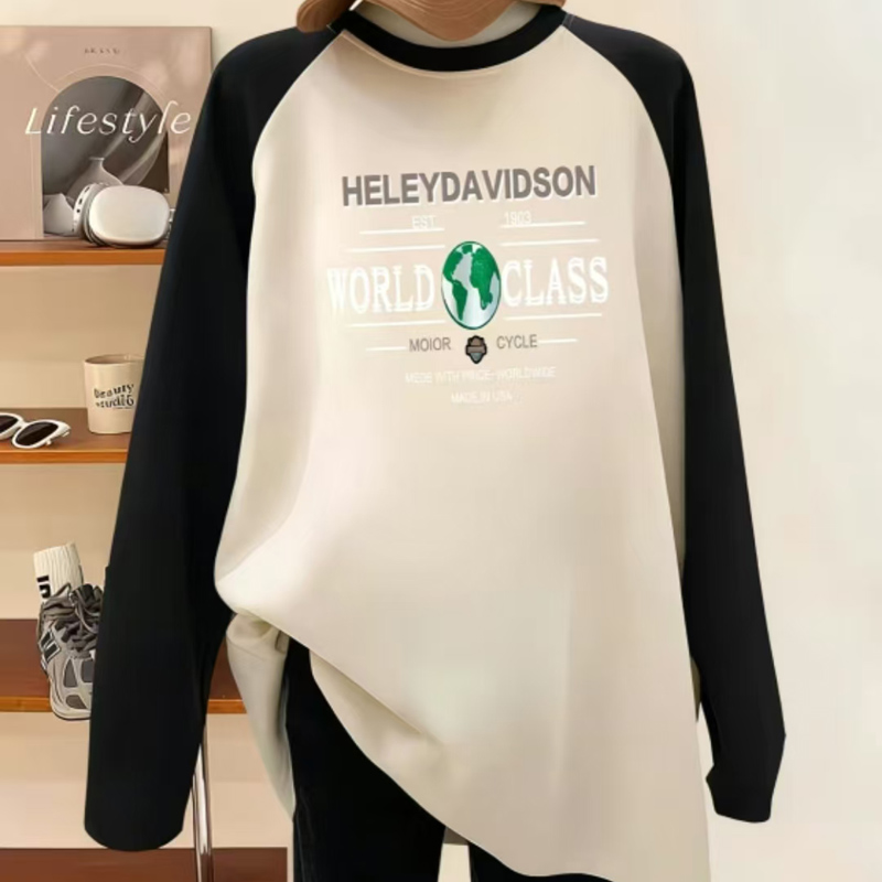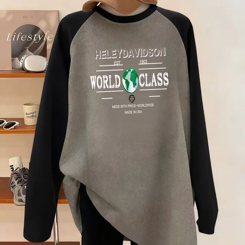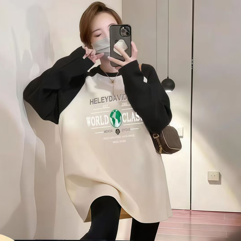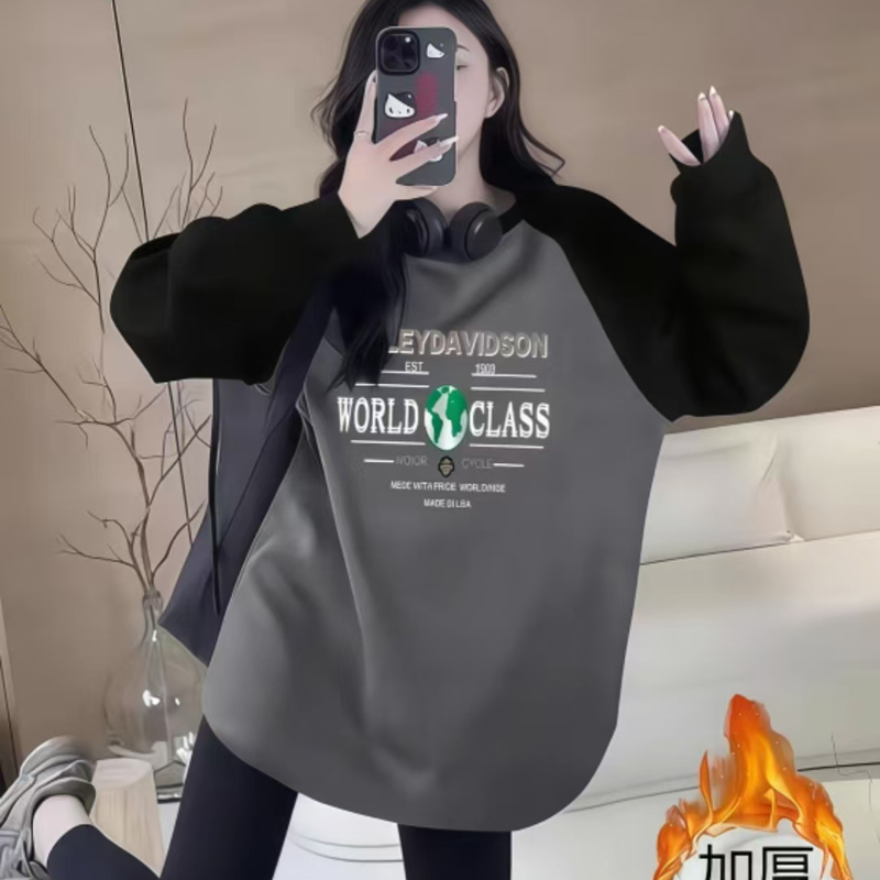 YF6680-(2色入内)德绒冬装字母印花长袖连肩二色拼接宽松大码加厚学院风潮流卫衣
