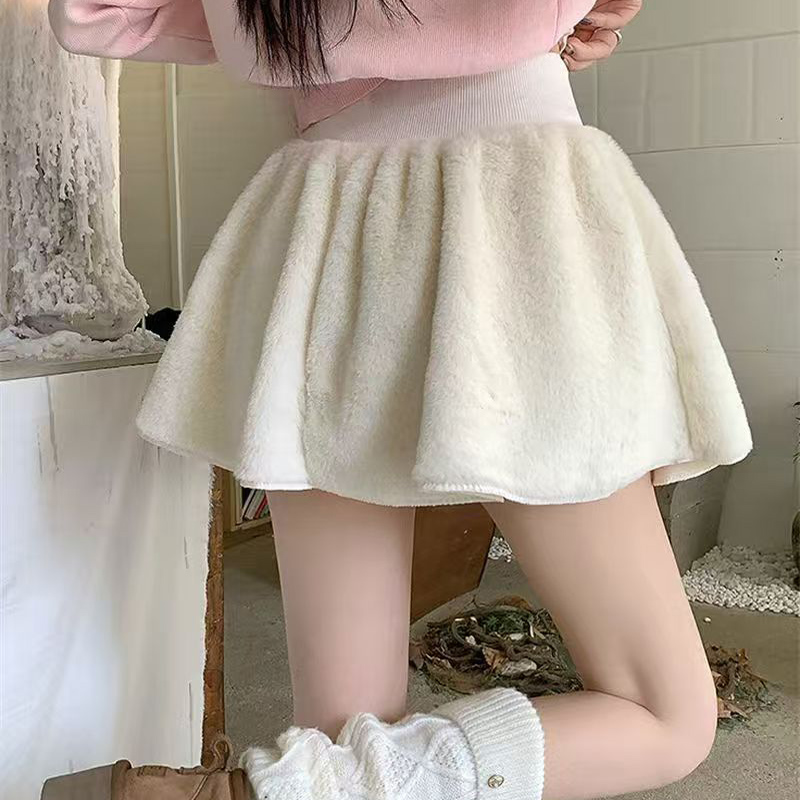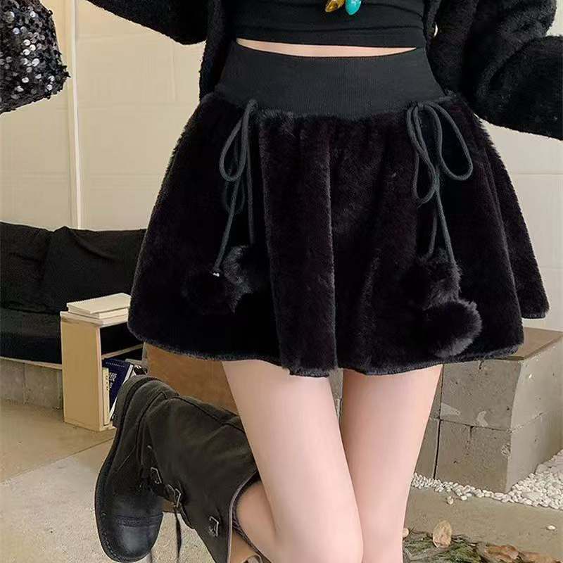 YF6683-(2色入内)小清新系绳毛毛球设计松紧腰A字防走光加厚毛毛绒冬季短裙