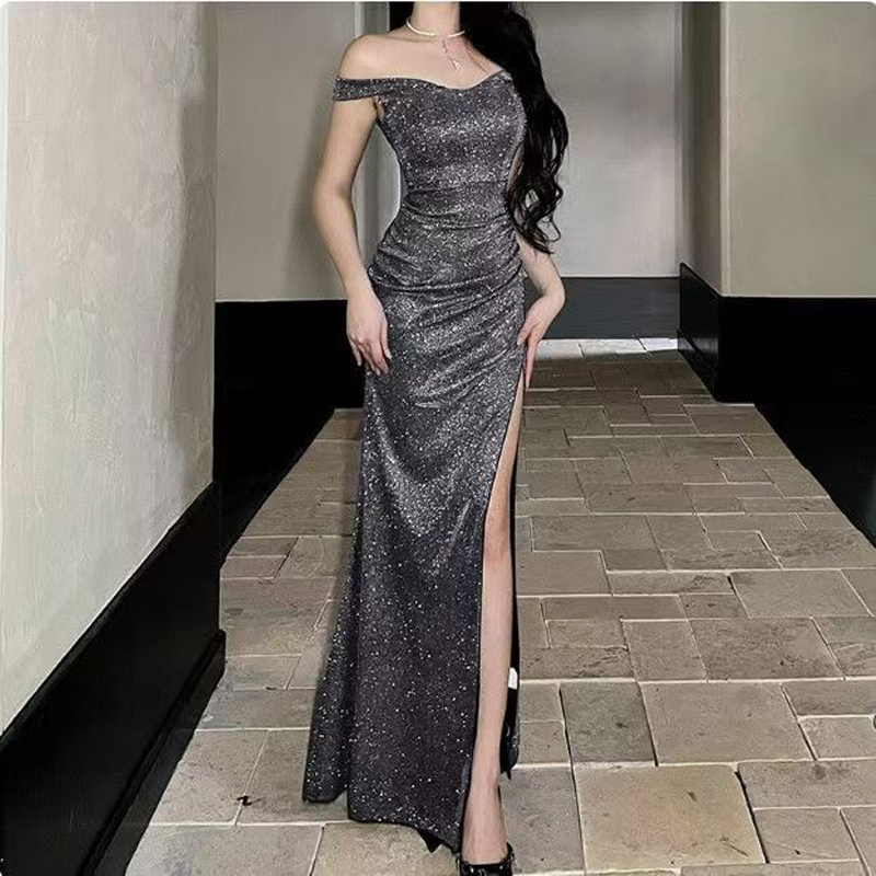 YF6689-(2色入内)名媛气质一字肩褶折开叉中长款亮片设计礼服