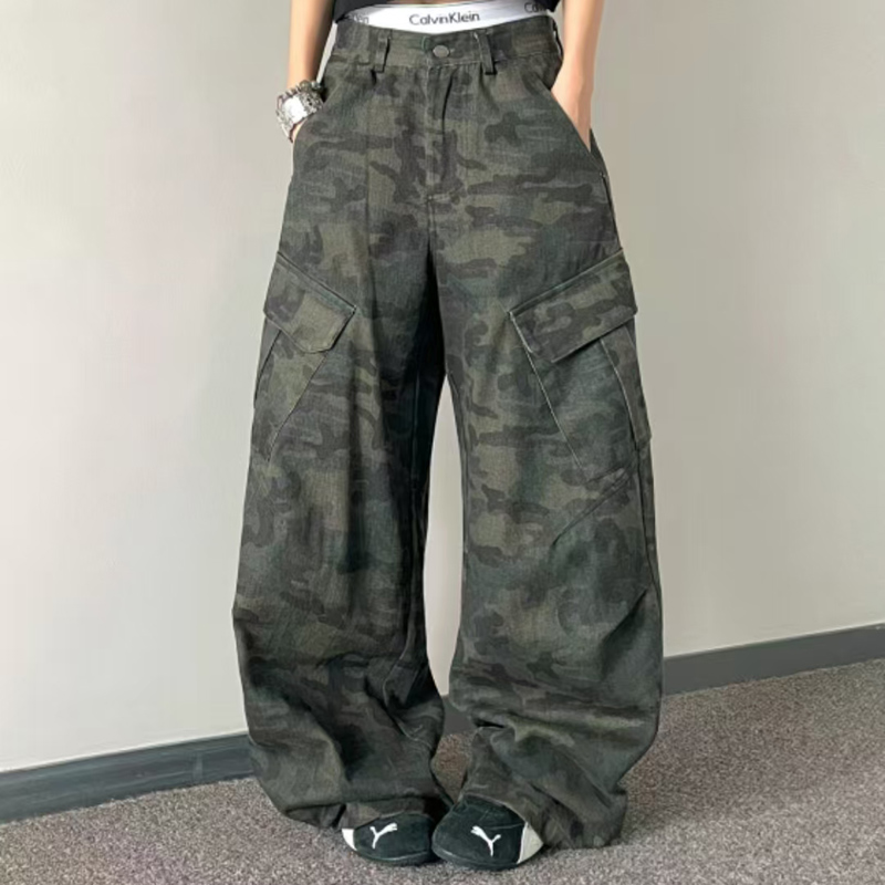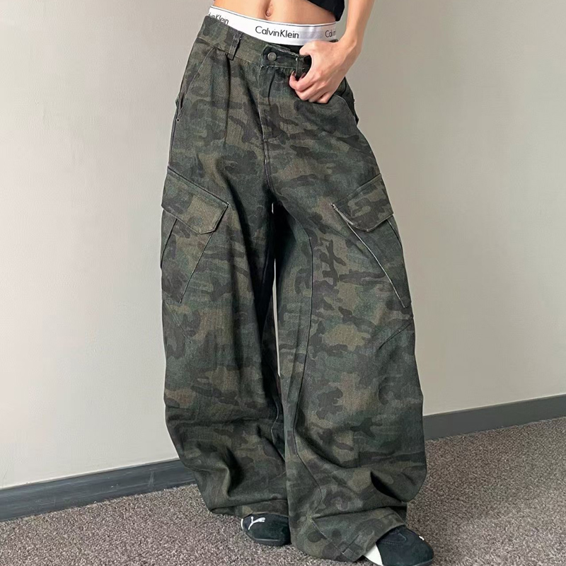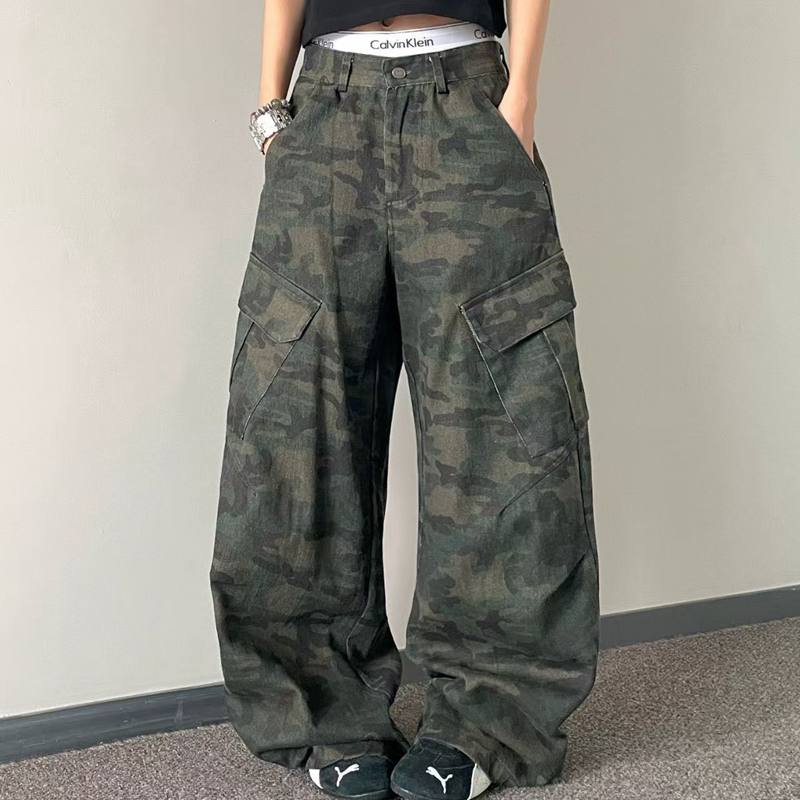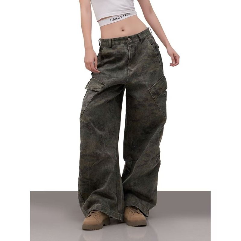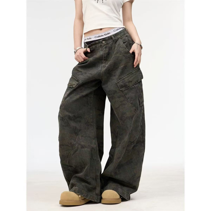 YF6690-图片色韩版潮慵懒风系扣高腰工装口袋洗水迷彩设计直筒坠地感牛仔裤