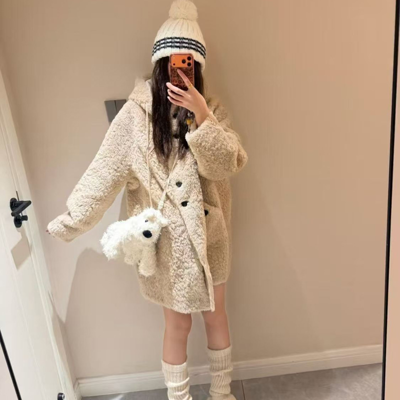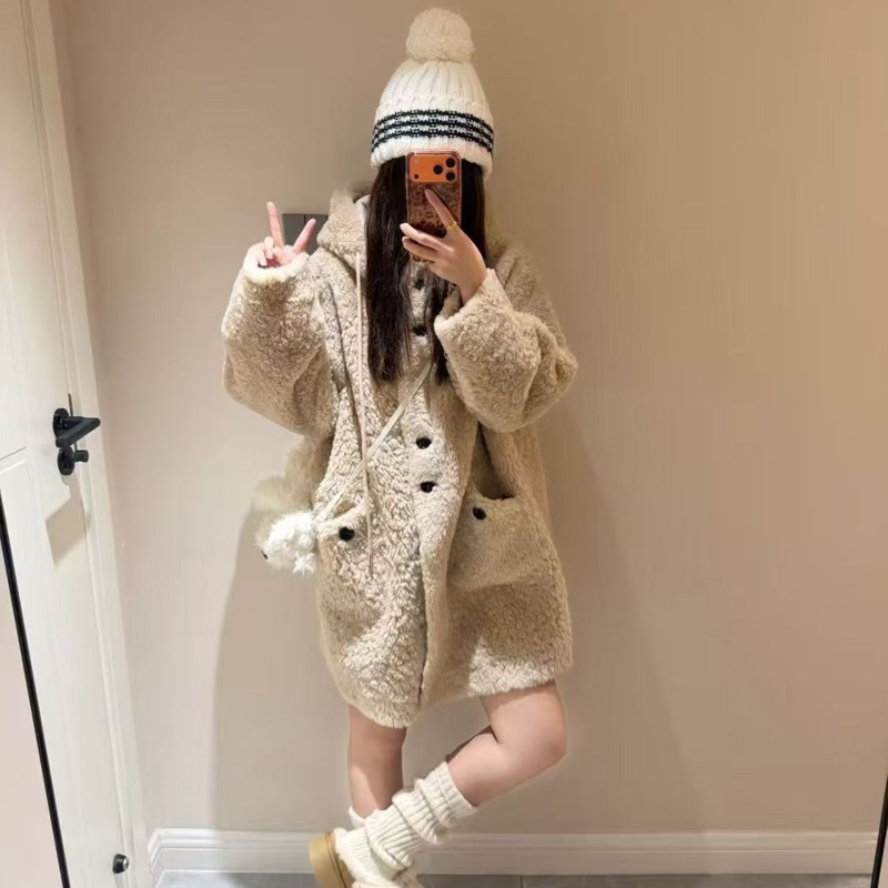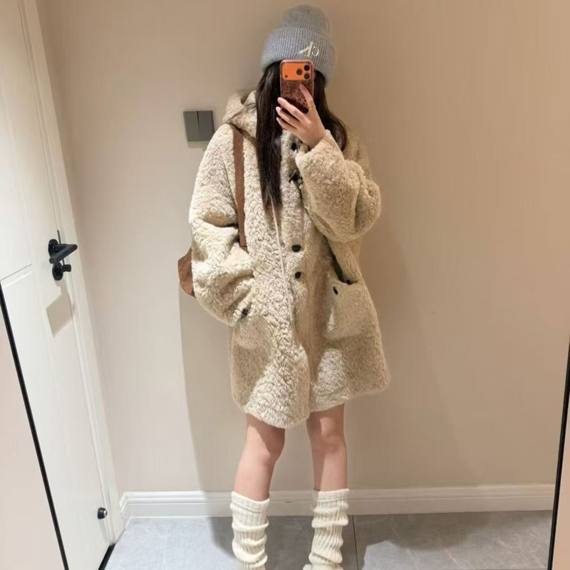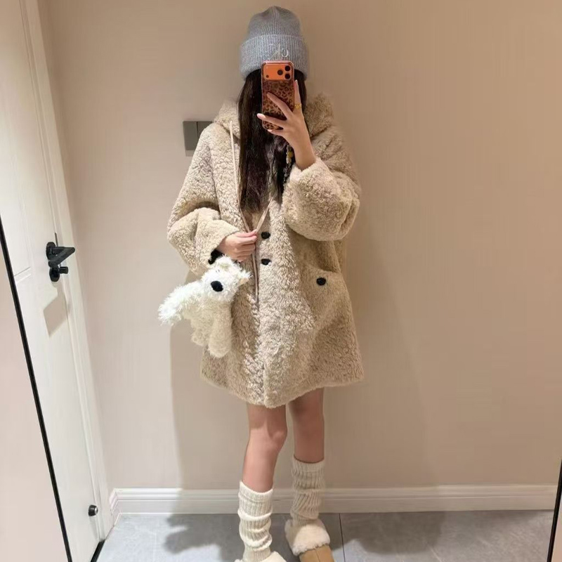 YF6691-图片色甜美时尚韩版长袖边帽系扣落肩设计软糯羊羔绒保暖中长工款外套