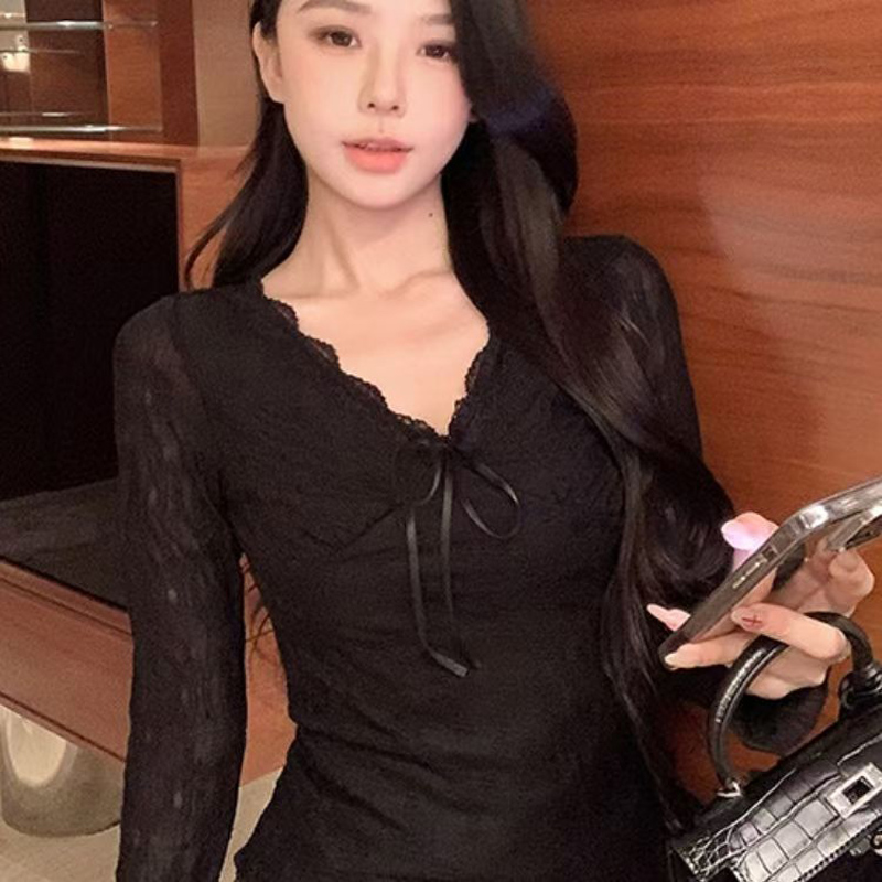 YF6696-(4色入内)温柔风提花蕾丝系蝴蝶结加绒保暖长袖花边V领打底上衣