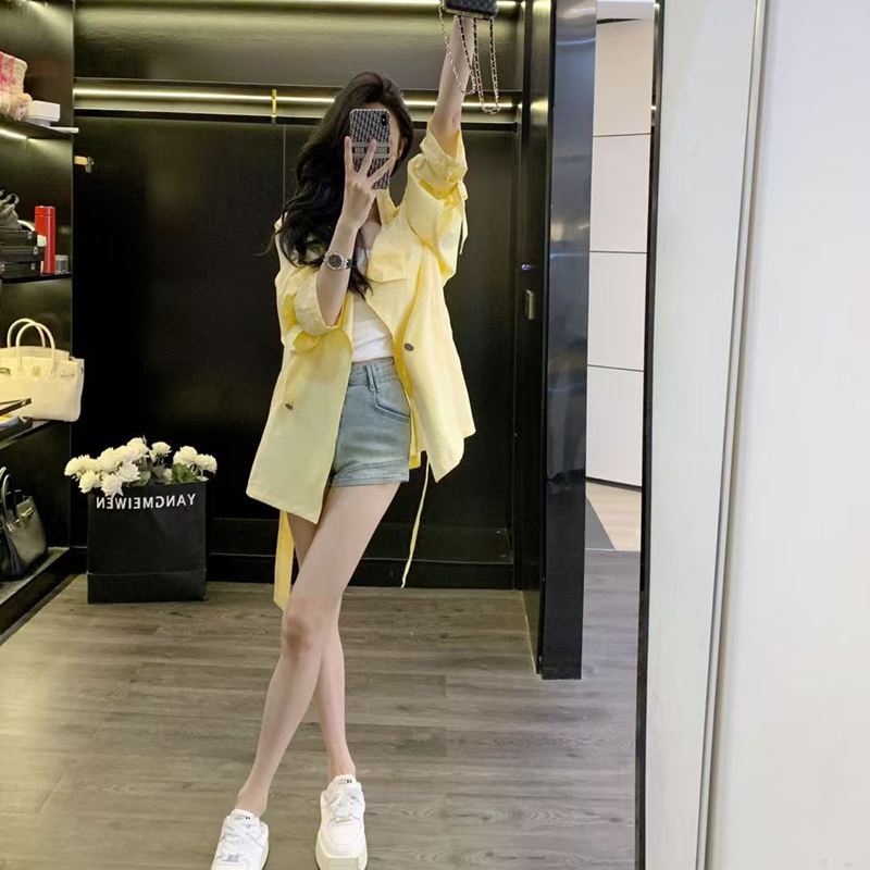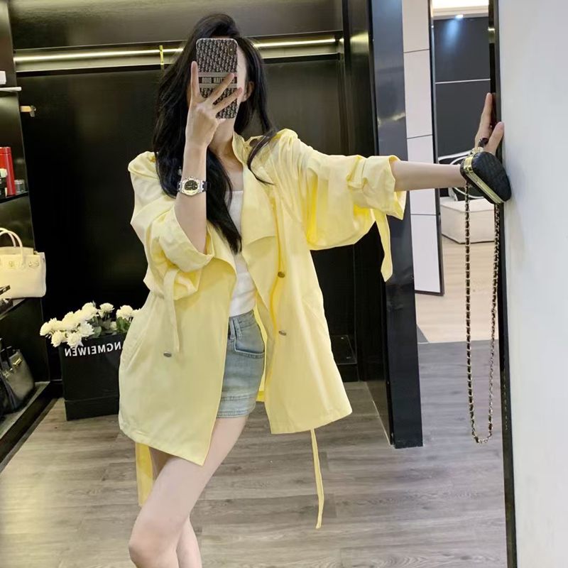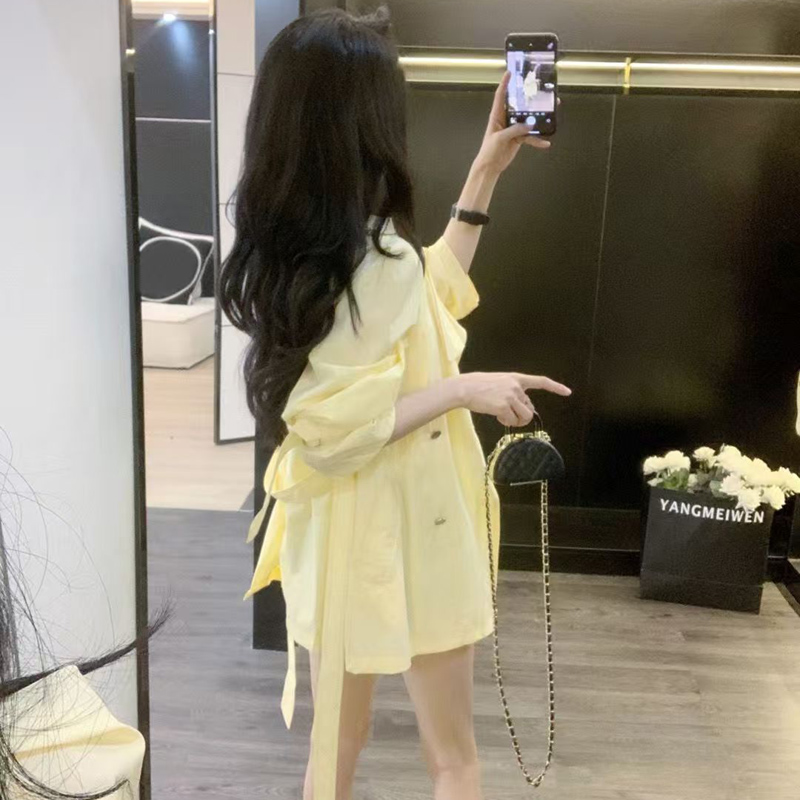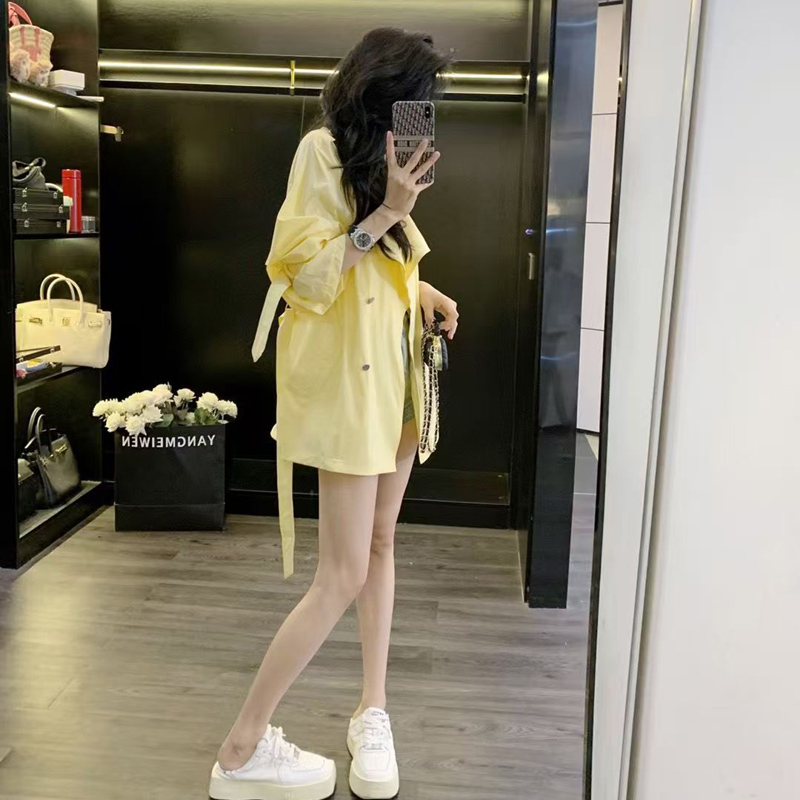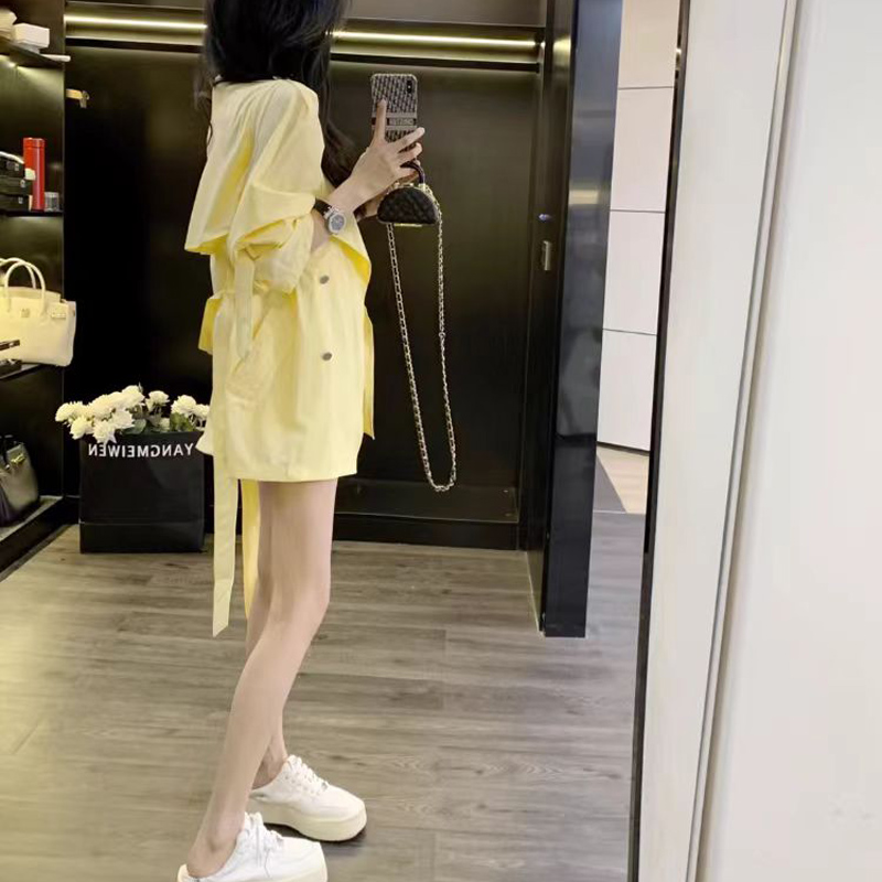 YF6697-图片色嫩黄色小众设计POLO领系腰带系扣休闲感大码显瘦法式风衣外套
