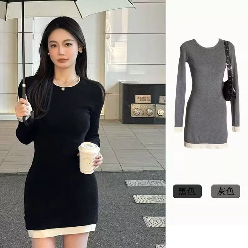 YF6698-(2色入内)港式假两件圆领长袖弹力修腰包臀二色设计德绒保暖秋冬打底裙