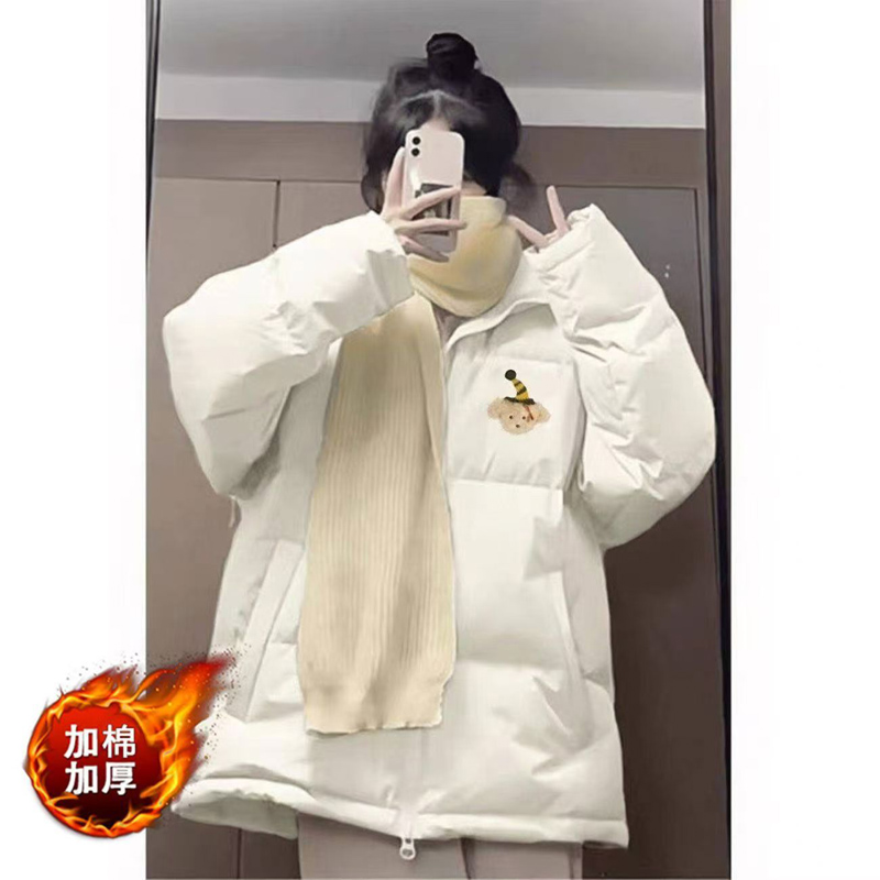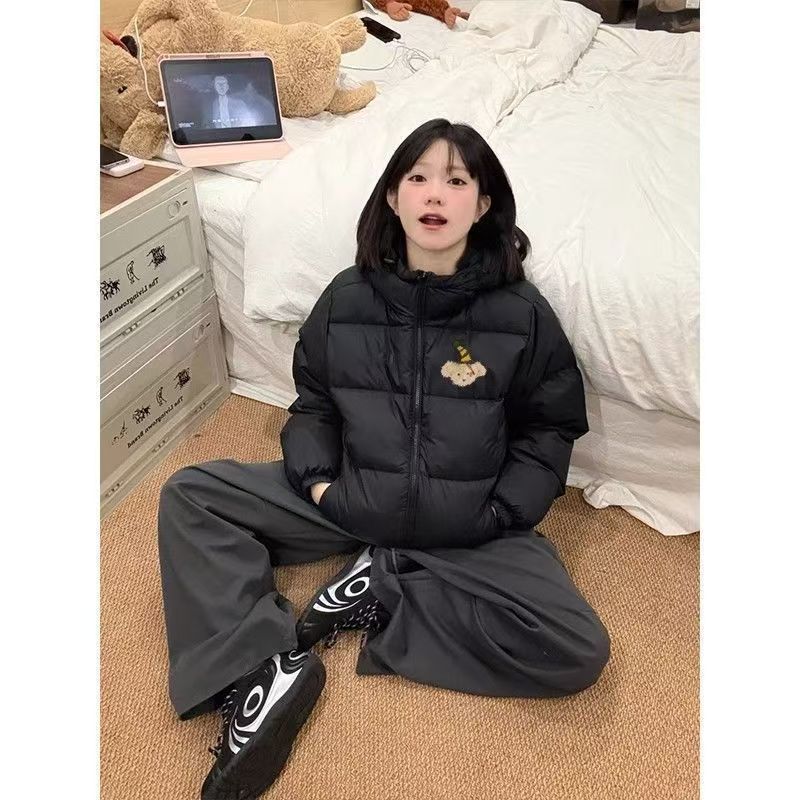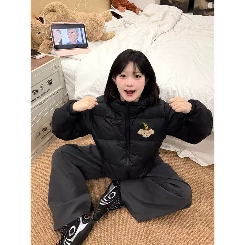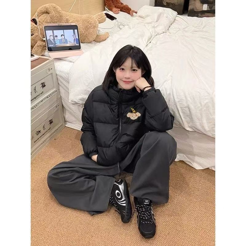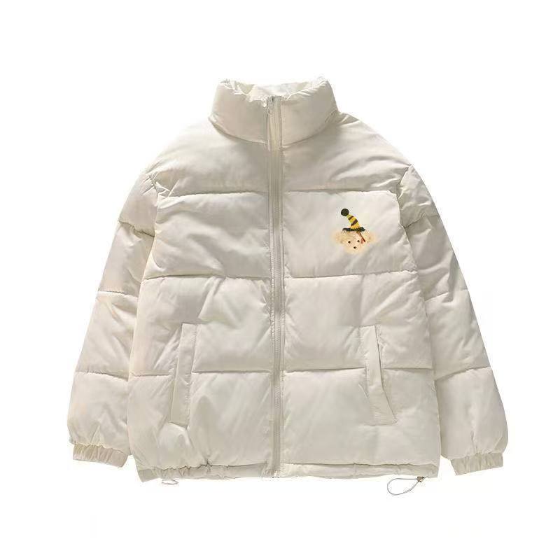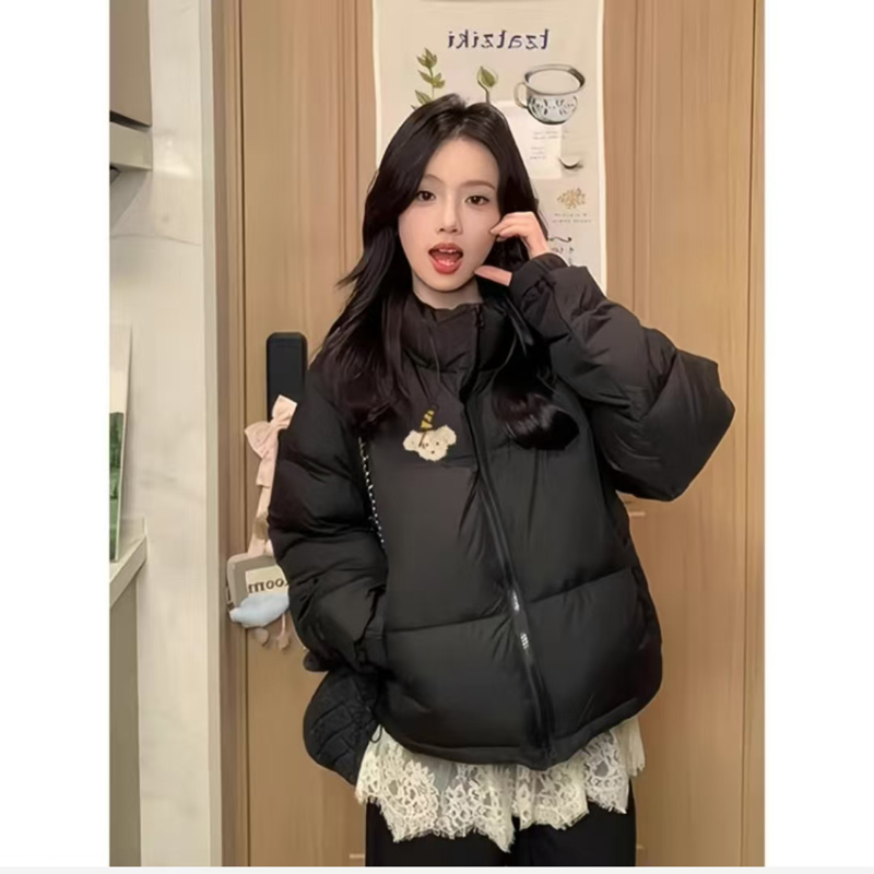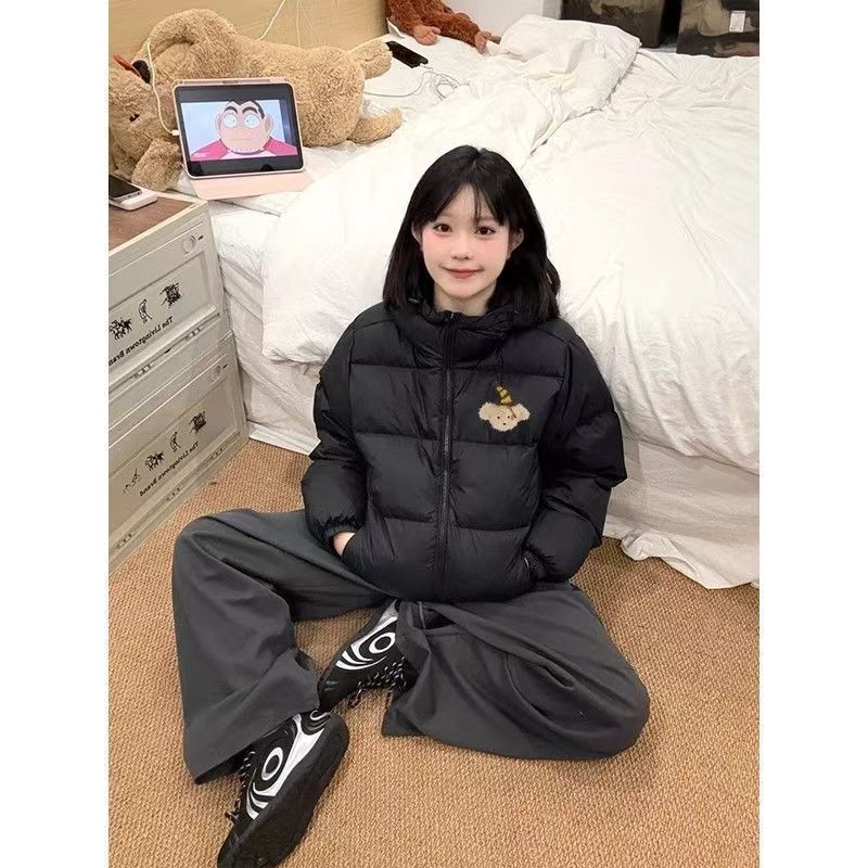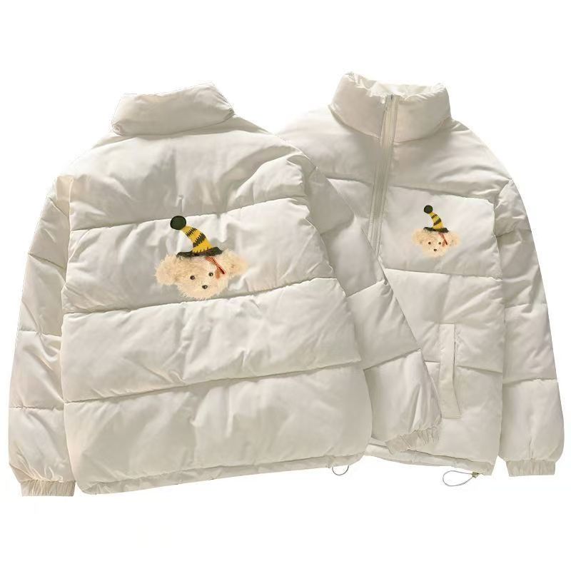 YF6700-(2色入内)小可爱熊熊刺绣长袖立领拉链加绒加厚抽绳束腰防风保暖羽绒服