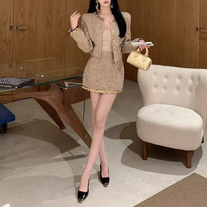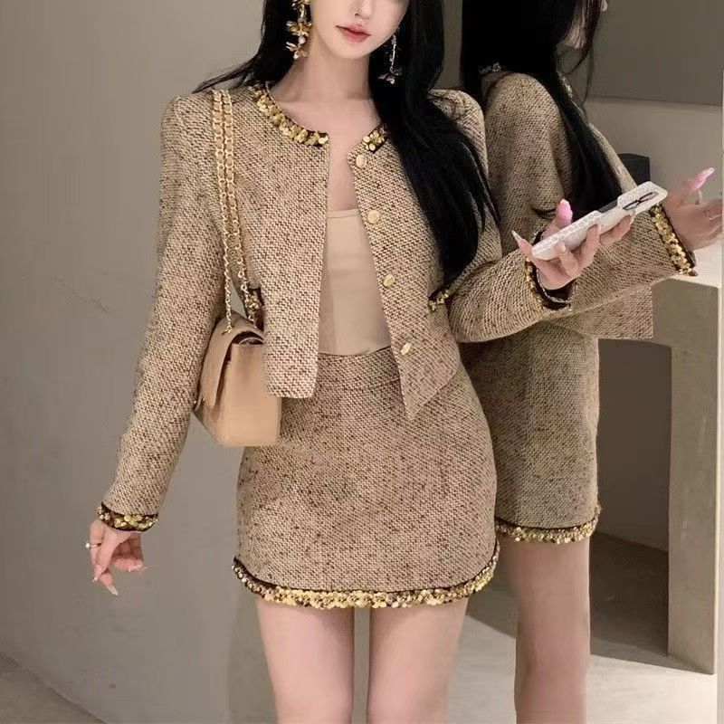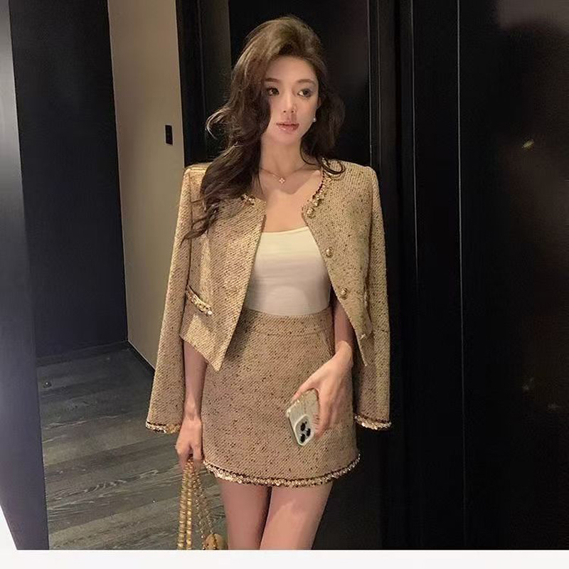 YF6701-图片色小香风粗毛呢高腰A字亮片金边设计防走光高级感半身裙