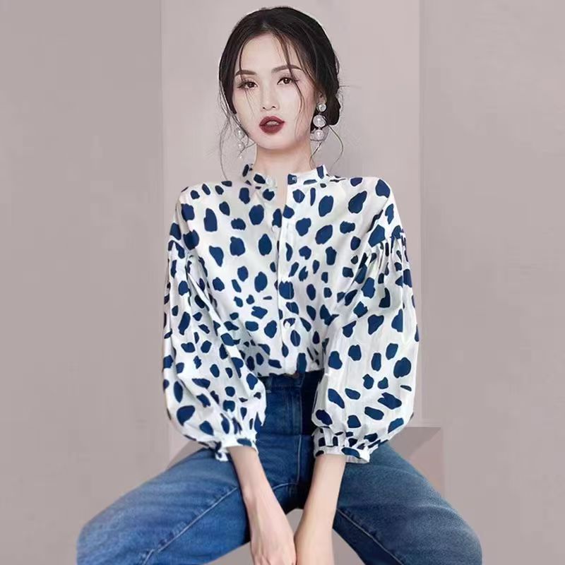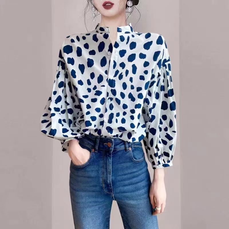 YF6703-图片色复古灯笼袖立领系扣斑点纹印花宽松大码春秋百搭新款上衣