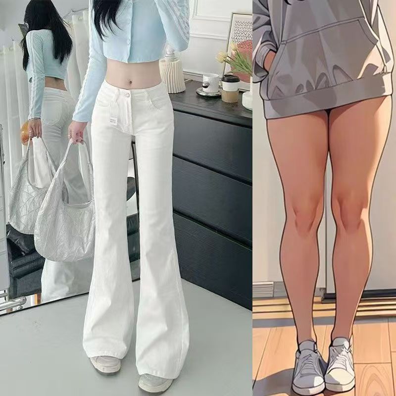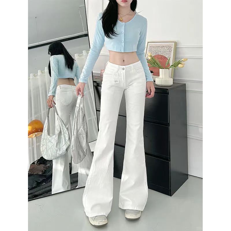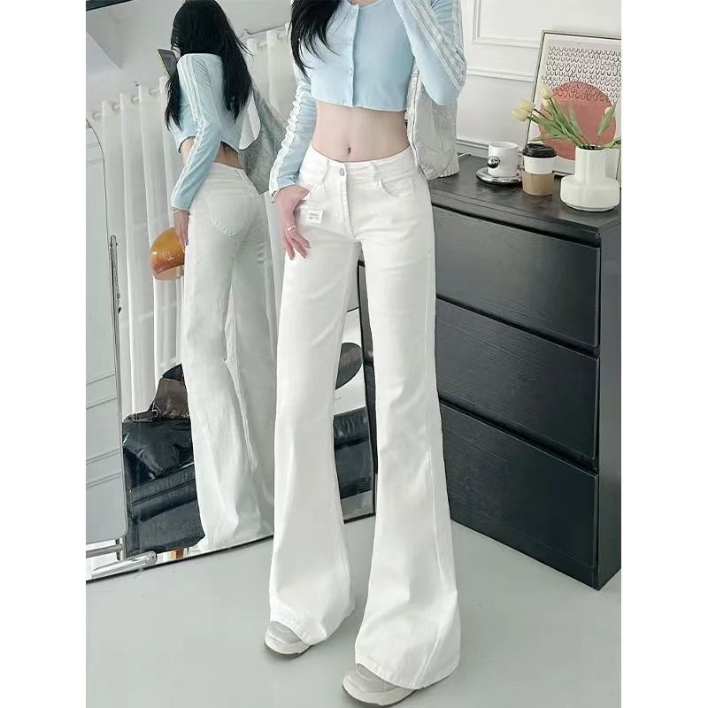 YF6705-图片色白色简洁小清新系扣高腰微喇叭坠地感弹力包臀百搭牛仔裤