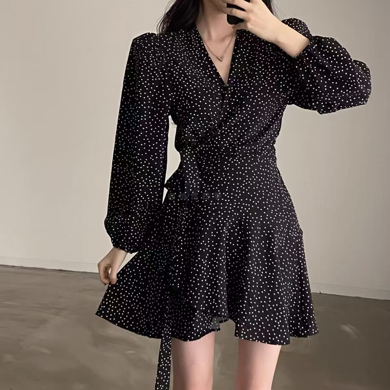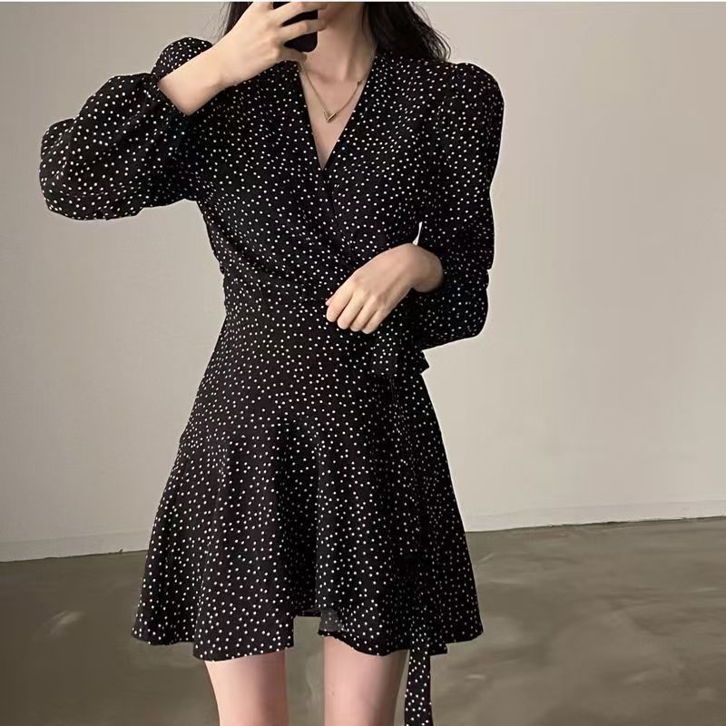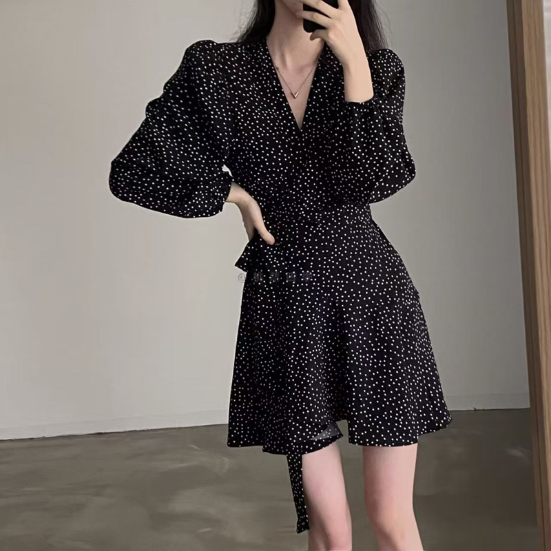 YF6706-图片色韩版小可爱迷人波点泡泡袖侧绑绳收腰小众设计赫本风连衣裙