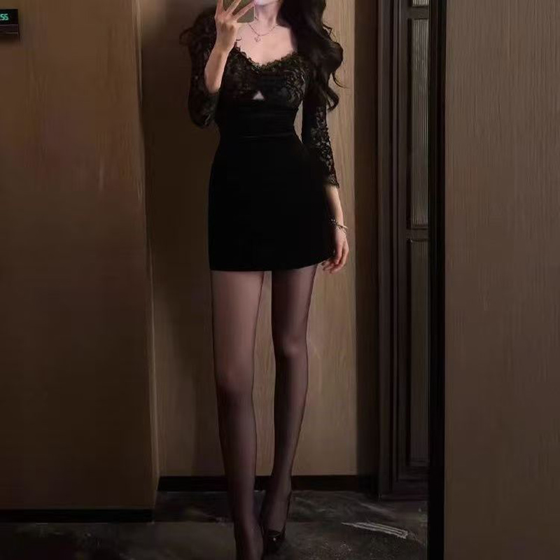 YF6709-图片色赫本风高级感长袖提花镂空收腰包臀轻奢设计蕾丝绸连衣裙