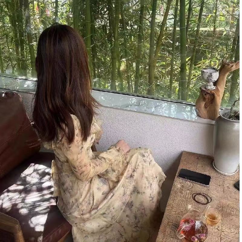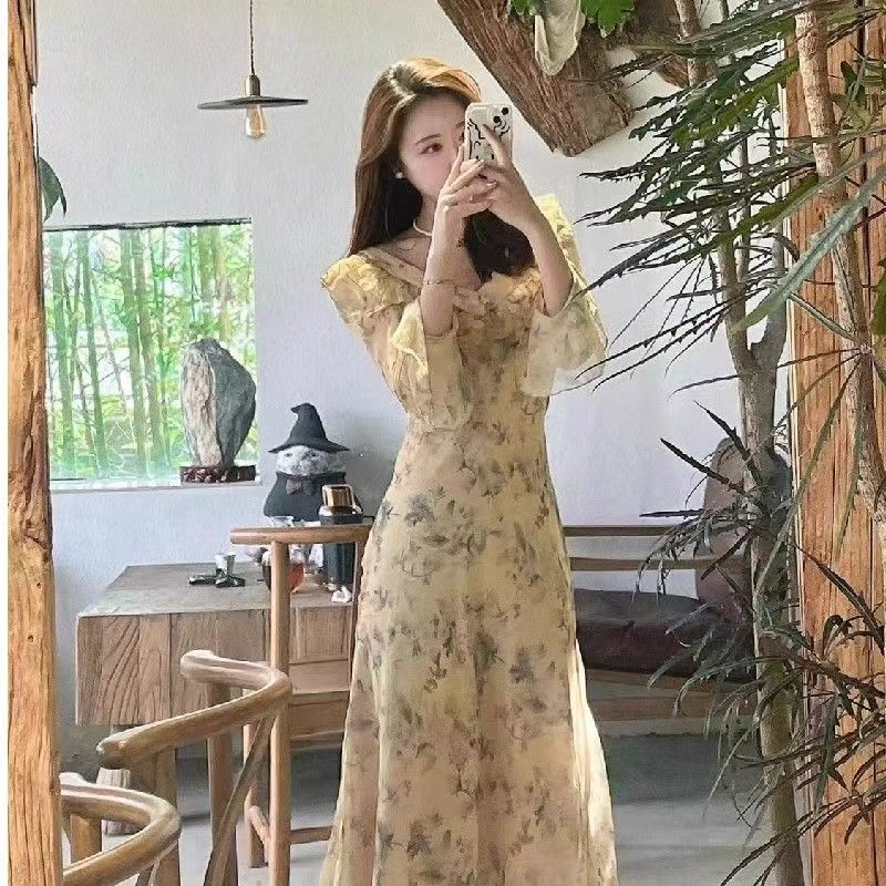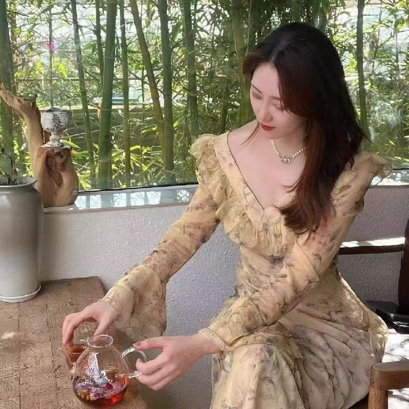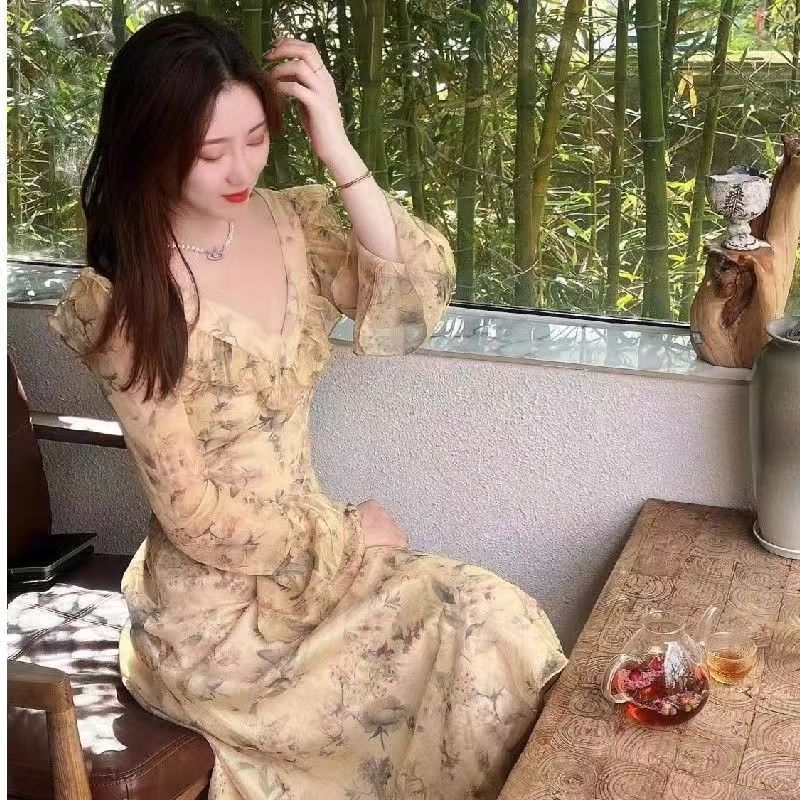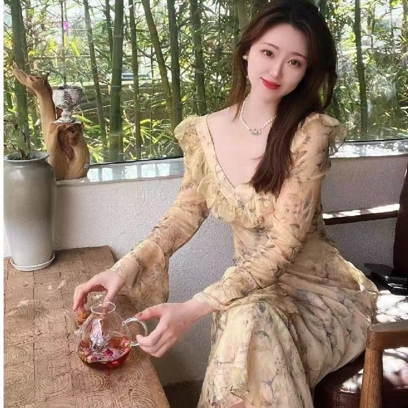 YF6719-图片色韩版型春秋百搭荷叶边V领木耳边长袖修身碎花雪纺连衣