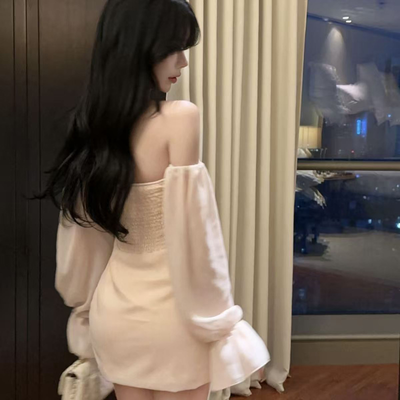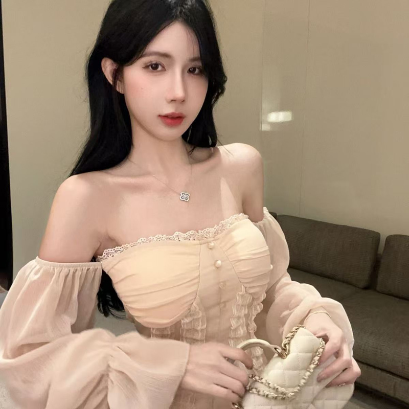 YF6721-图片色性感辣妹一字肩泡泡袖花边裹胸提花波纹设计低胸蕾丝礼服裙