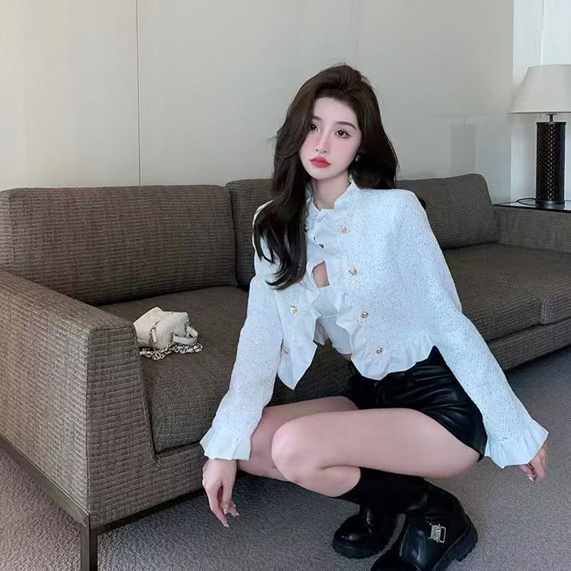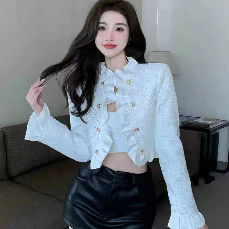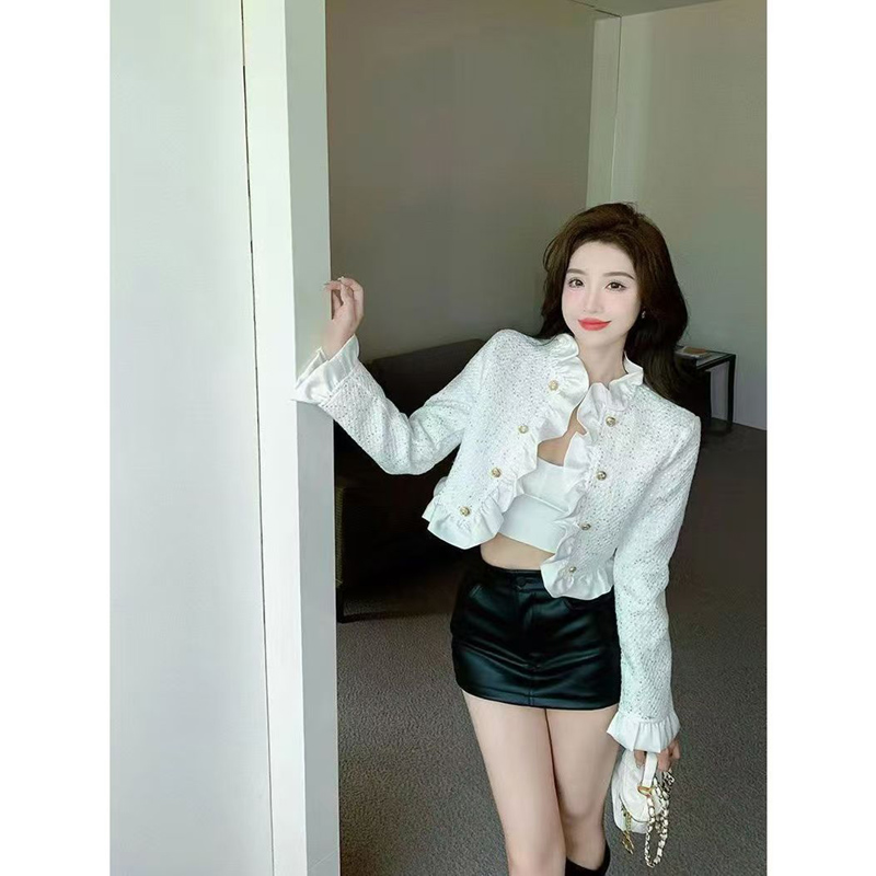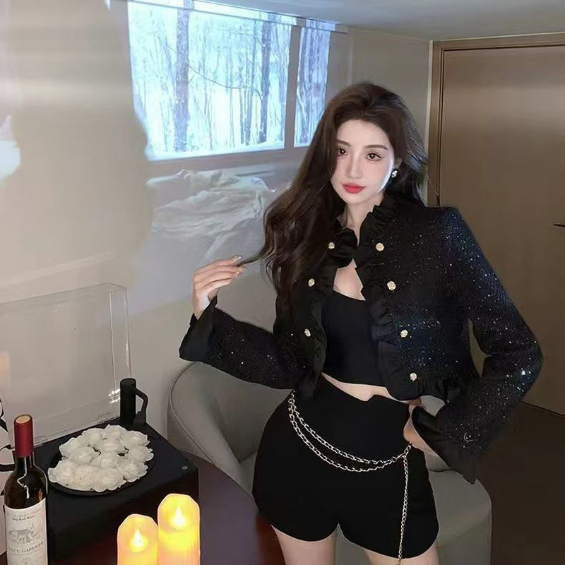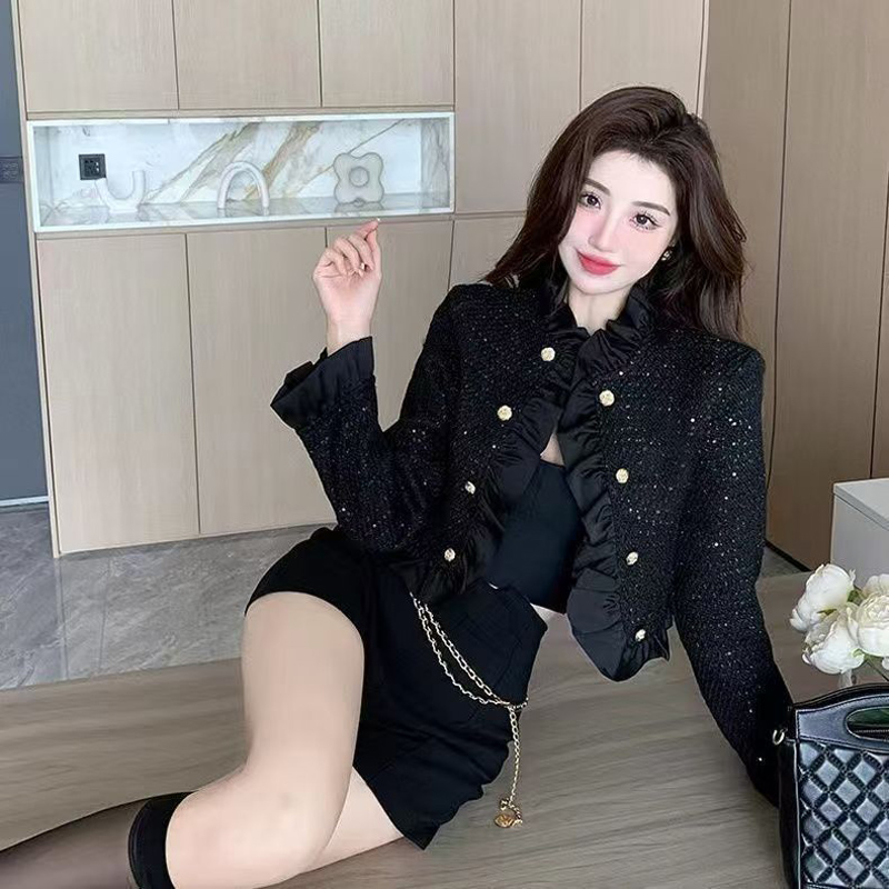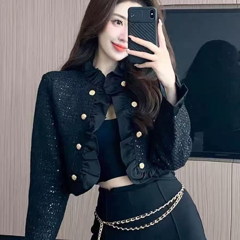 YF6726-(2色入内)韩版型小香风闪闪亮面料荷叶边长袖排扣短装小西装