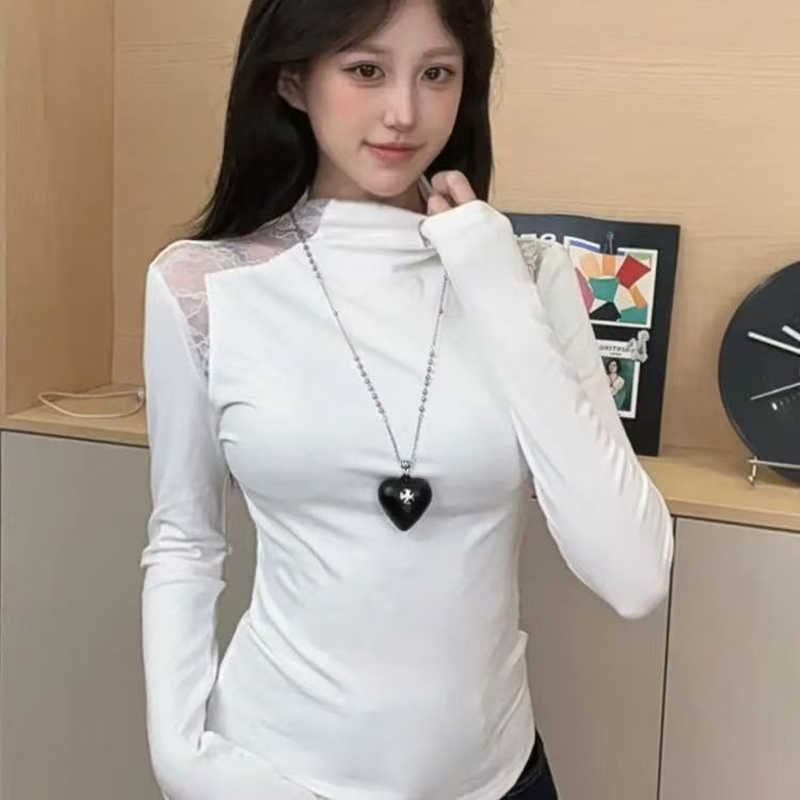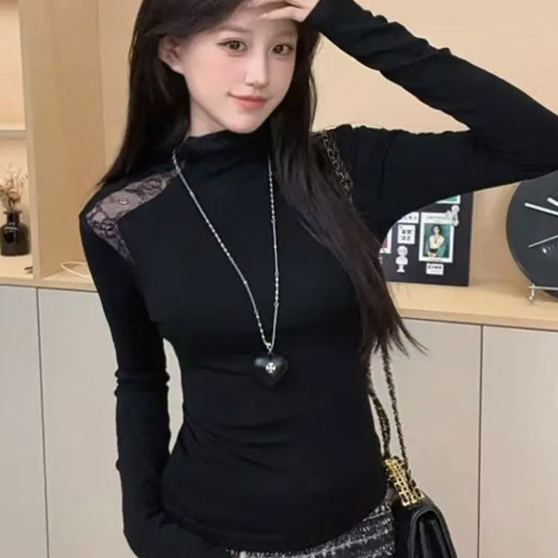 YF6727-(3色入内)韩版型镂空长袖半高领弹力修身加绒纯色蕾丝拼接打底衫