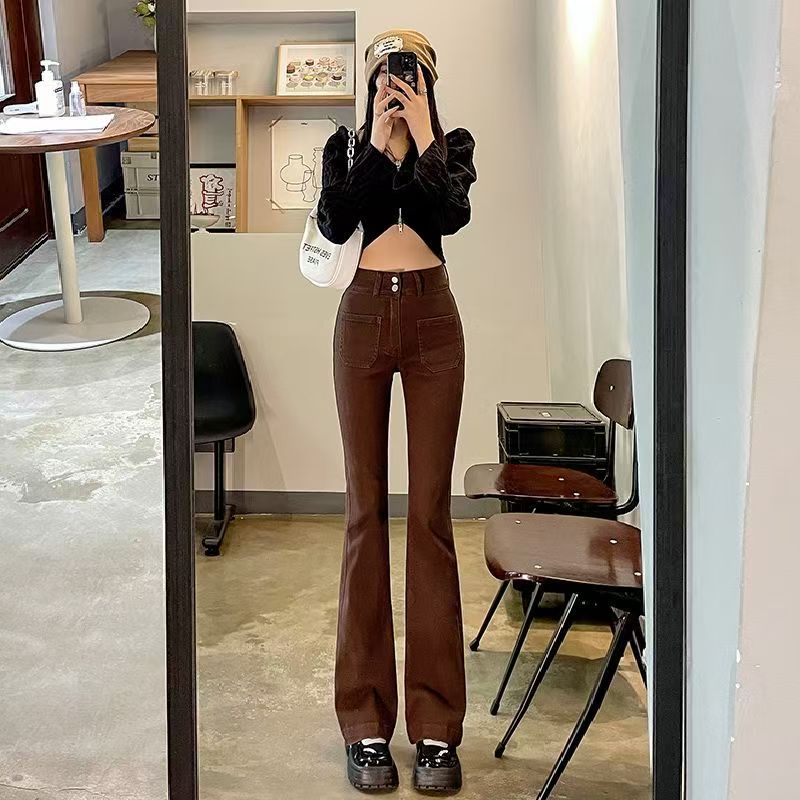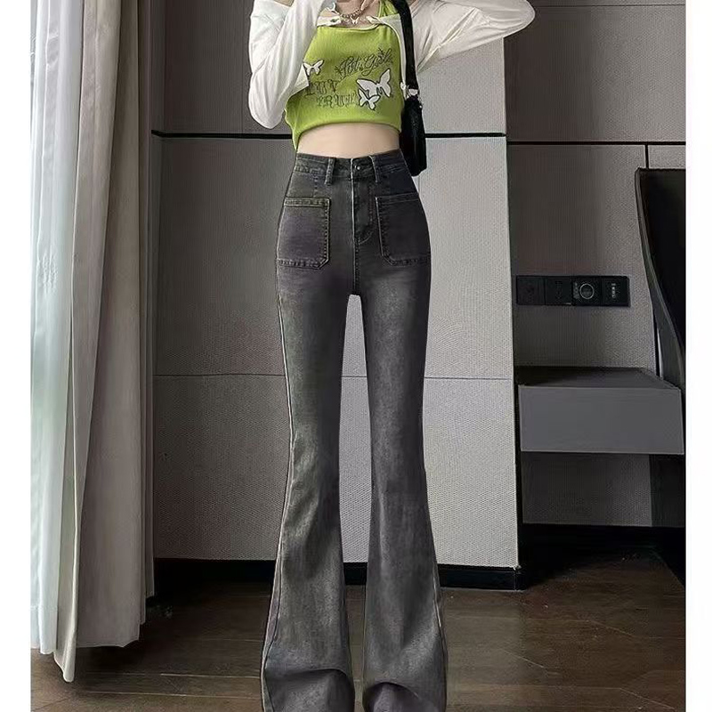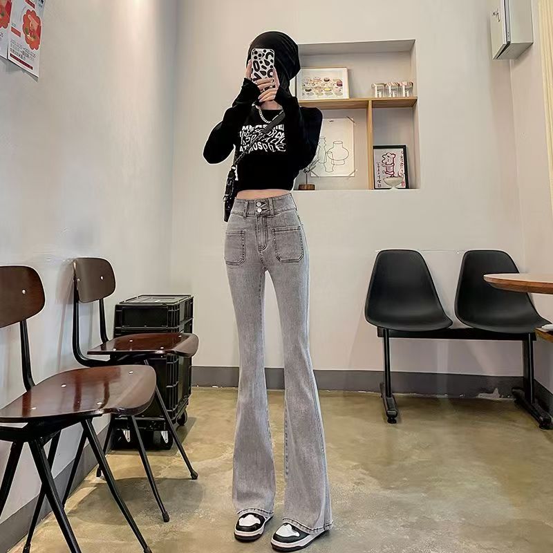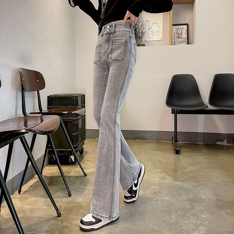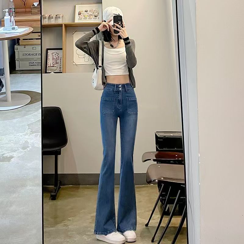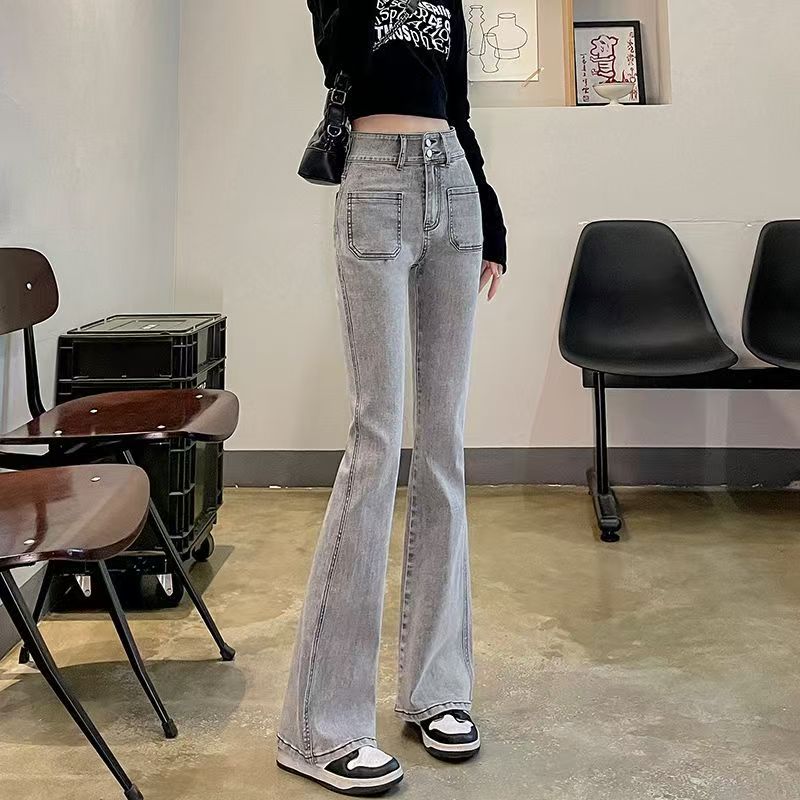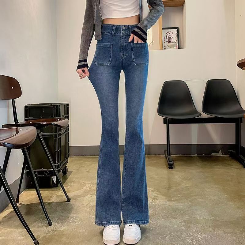 YF6834-(3色入内)辣妹时髦系扣高腰直插口袋微喇叭弹力包臀显瘦牛仔裤