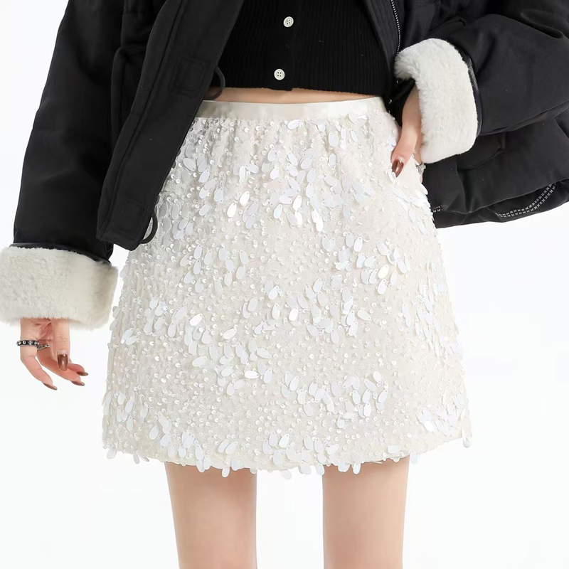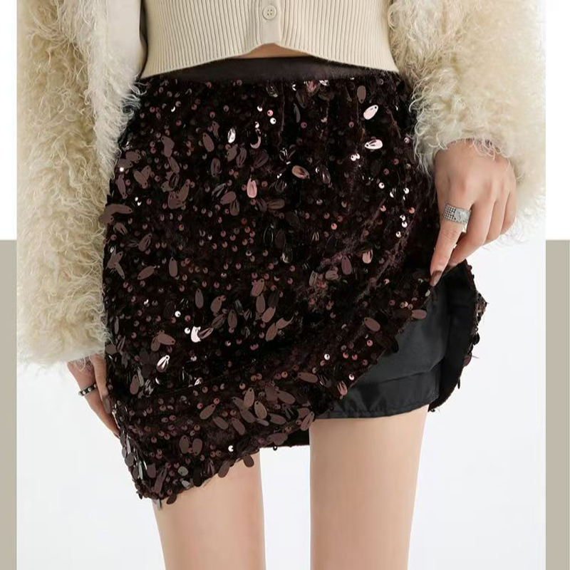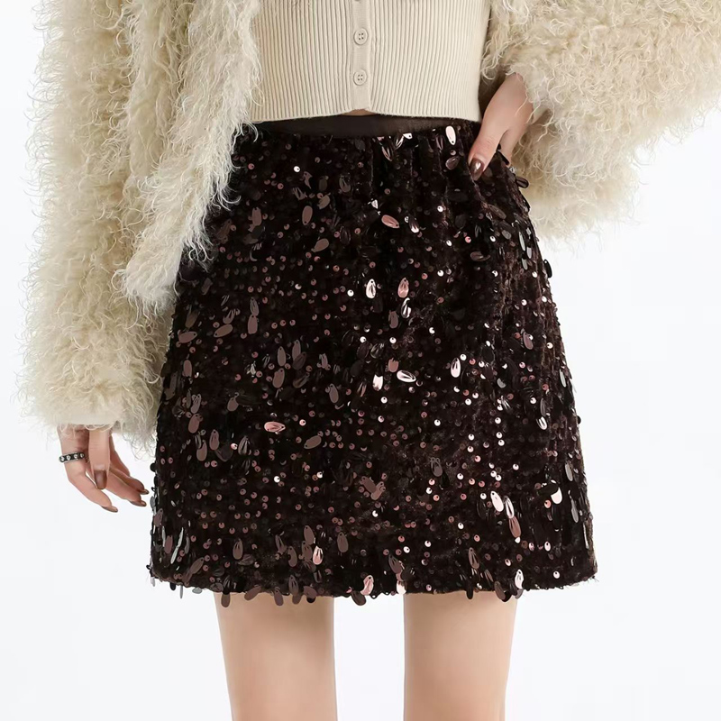 YF6835-(3色入内)时尚重工亮片设计吸睛别致松紧腰A字包臀显瘦纯色半身短裙