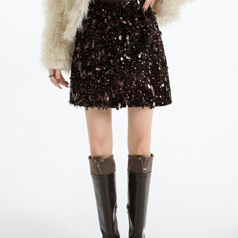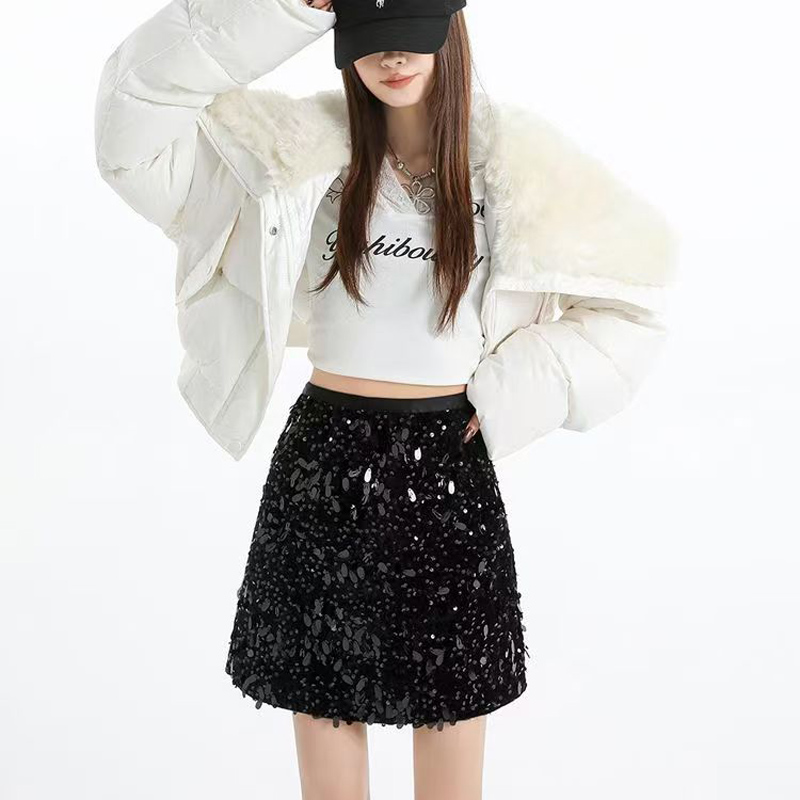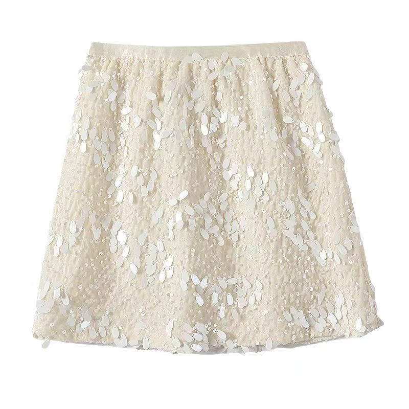 YF6835-(3色入内)时尚重工亮片设计吸睛别致松紧腰A字包臀显瘦纯色半身短