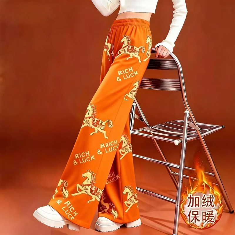 YF6843-(3色入内)2026马年冬季加绒时尚印花松紧腰直筒坠地感休闲卫衣裤