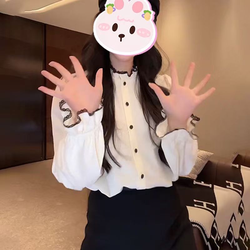 YF6848-图片色春秋时尚木耳边长袖花边领系扣复古设计感大码上衣潮