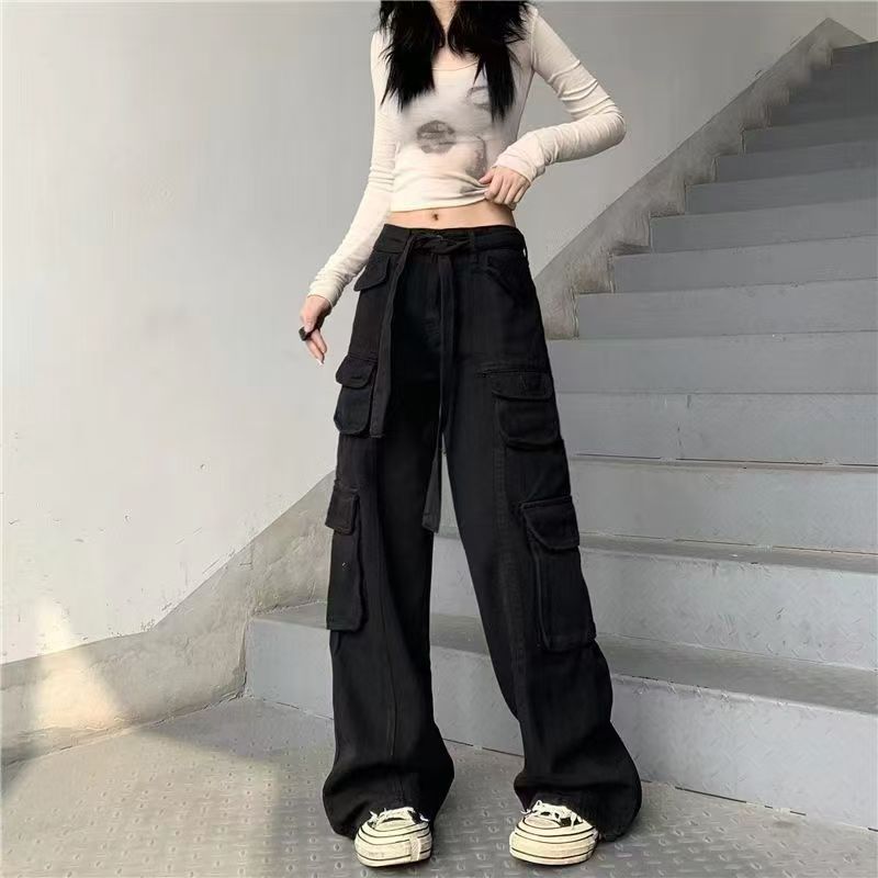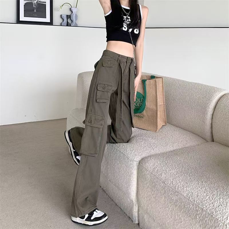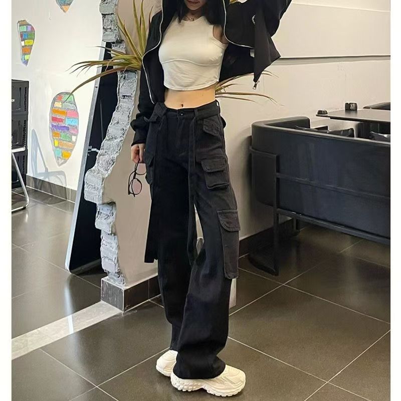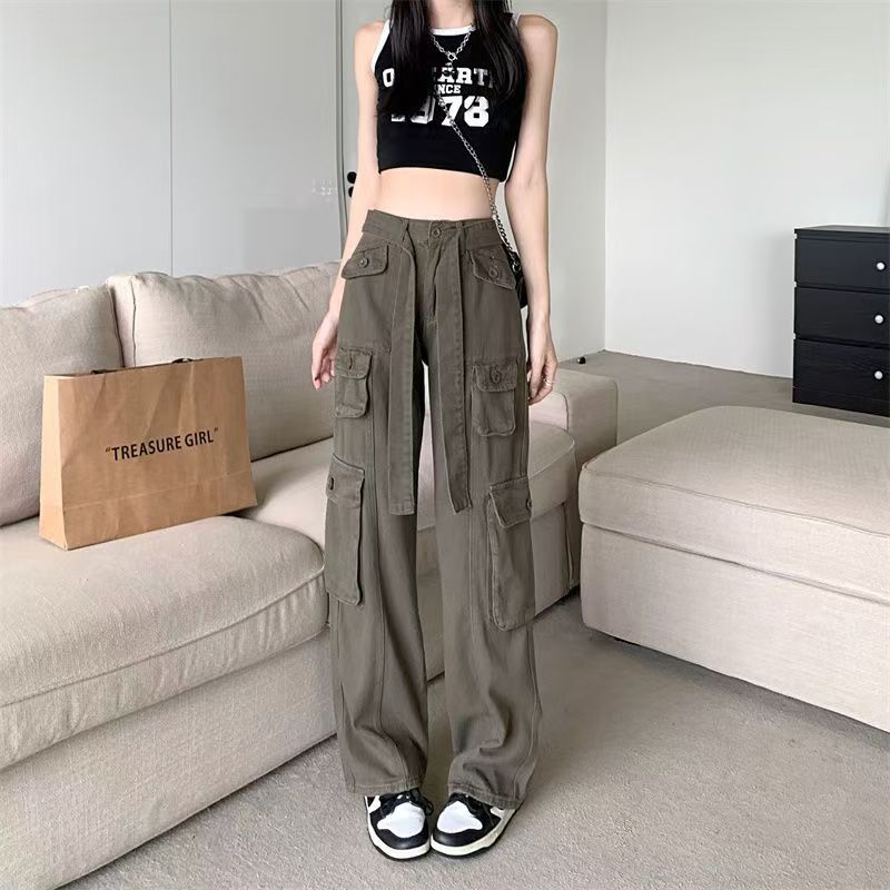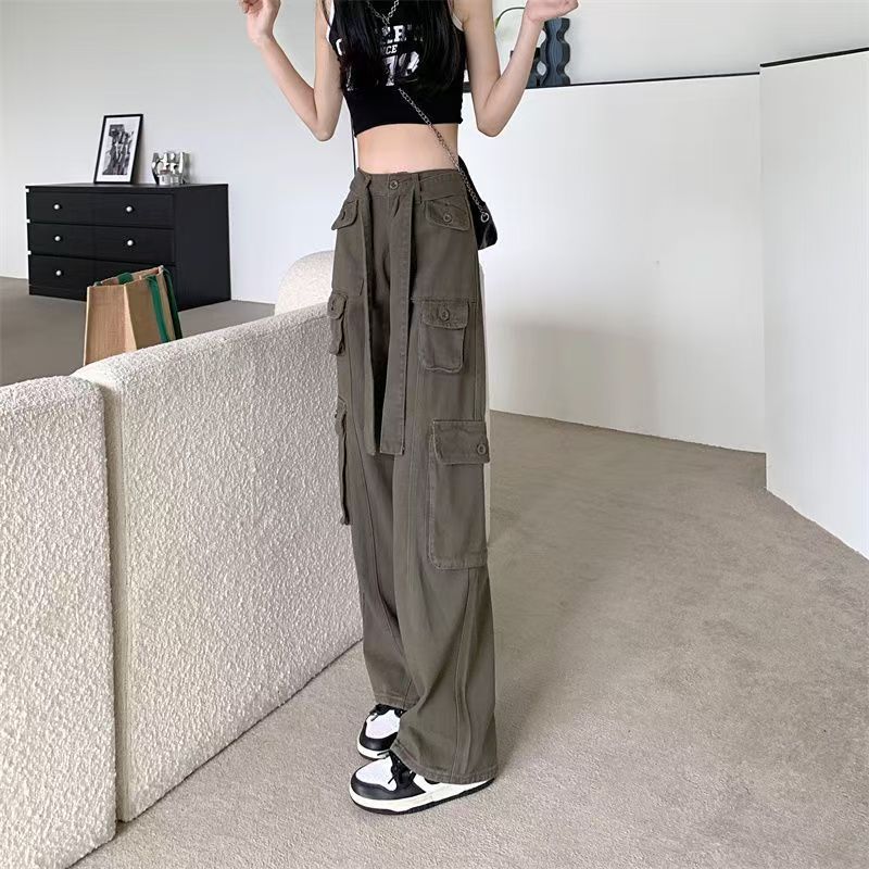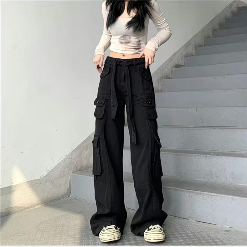 YF6850-(2色入内)港式个性工装绑带系扣多口袋设计直筒坠地感阔腿裤